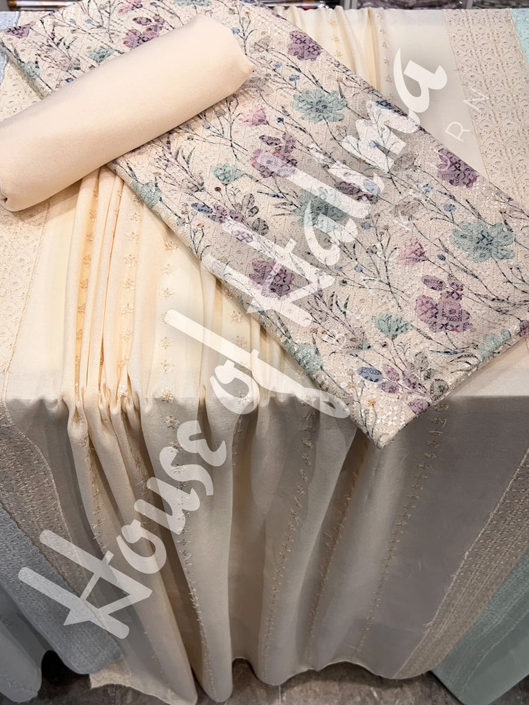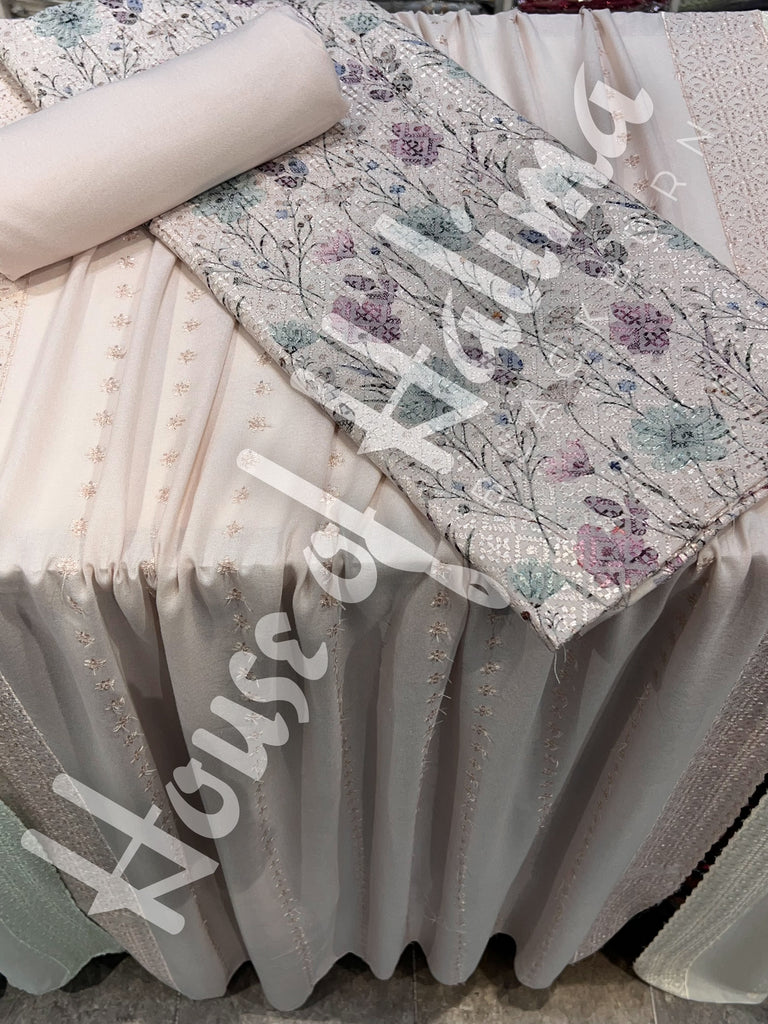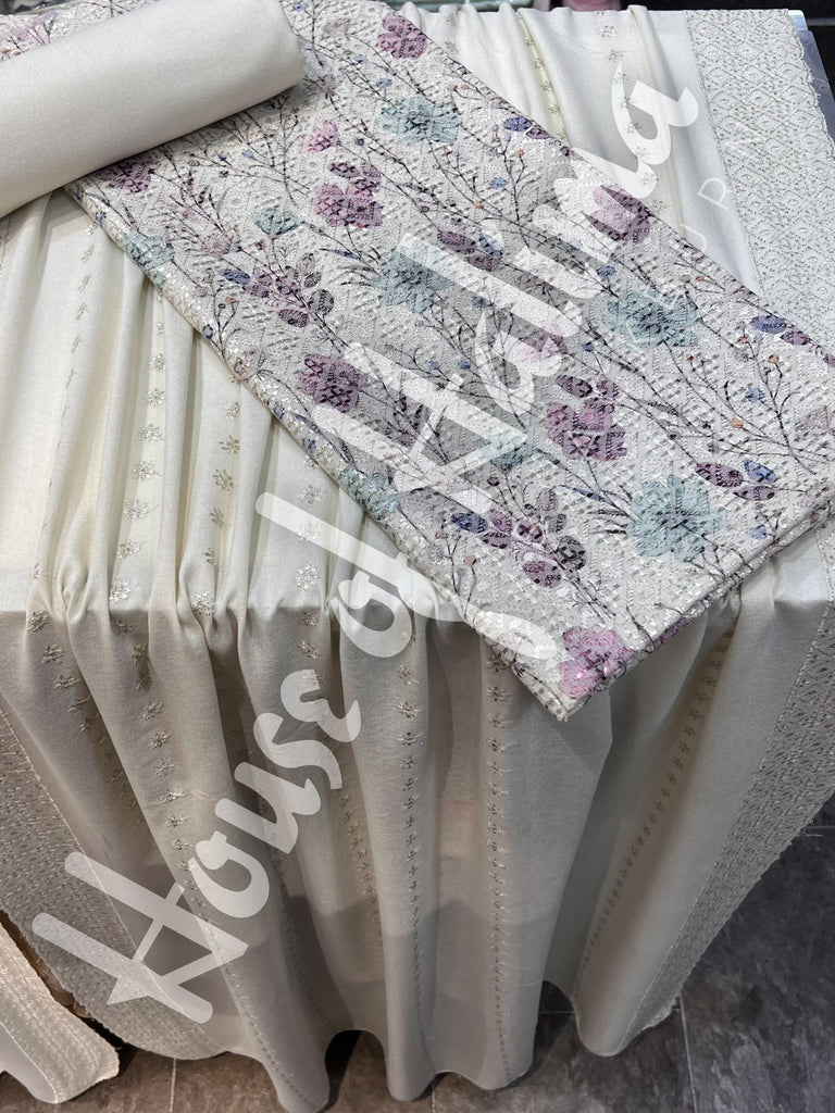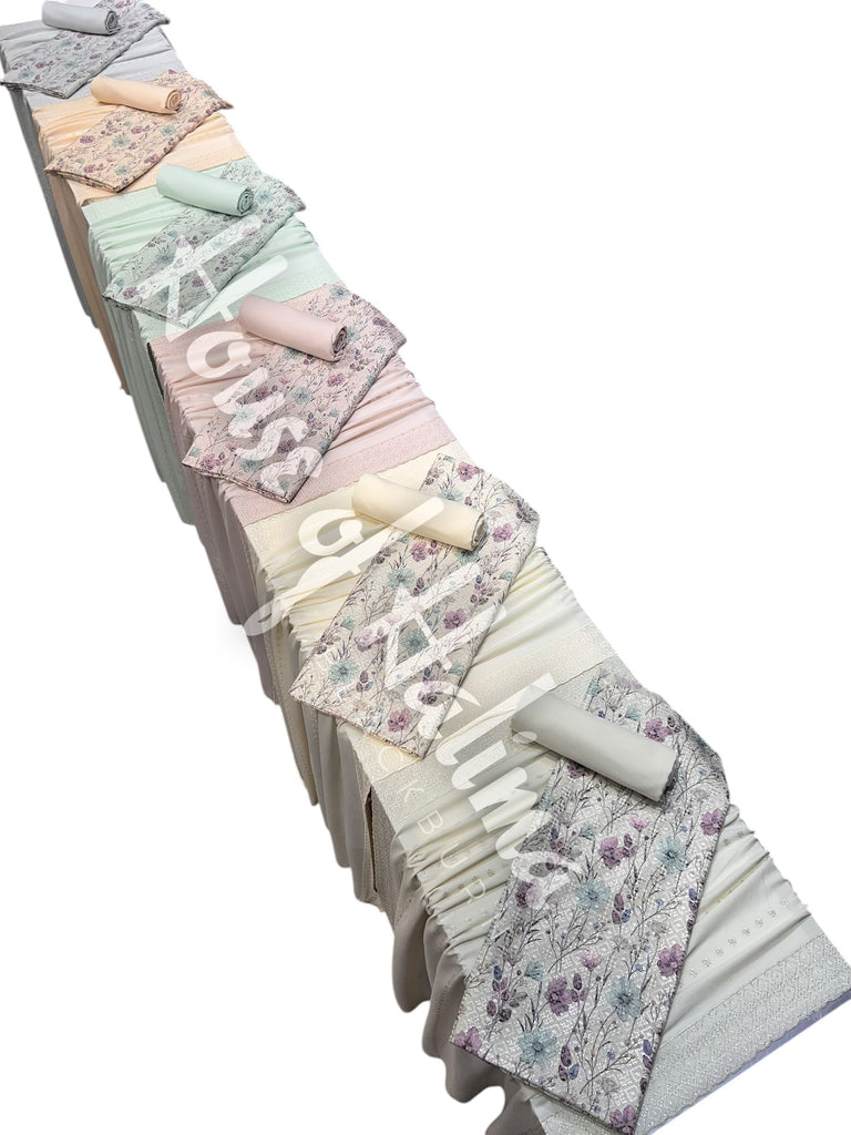 Pastel shade alpine suits with full front and back embroidery. Comes with embroidered alpine shawl.