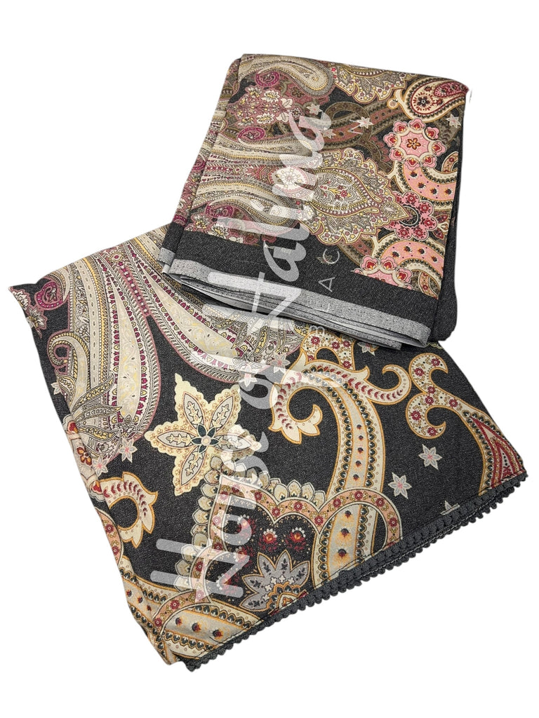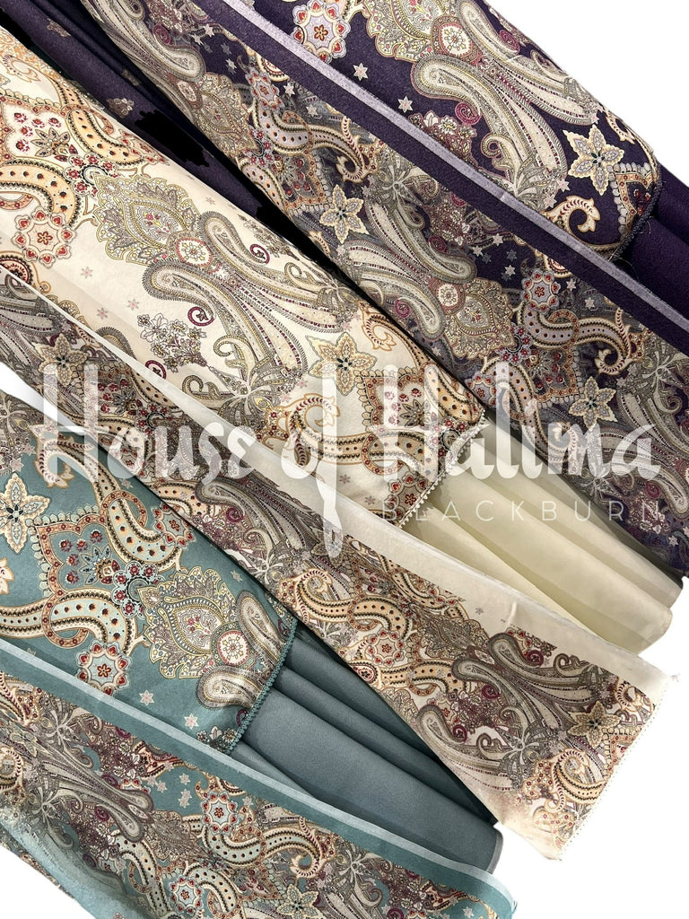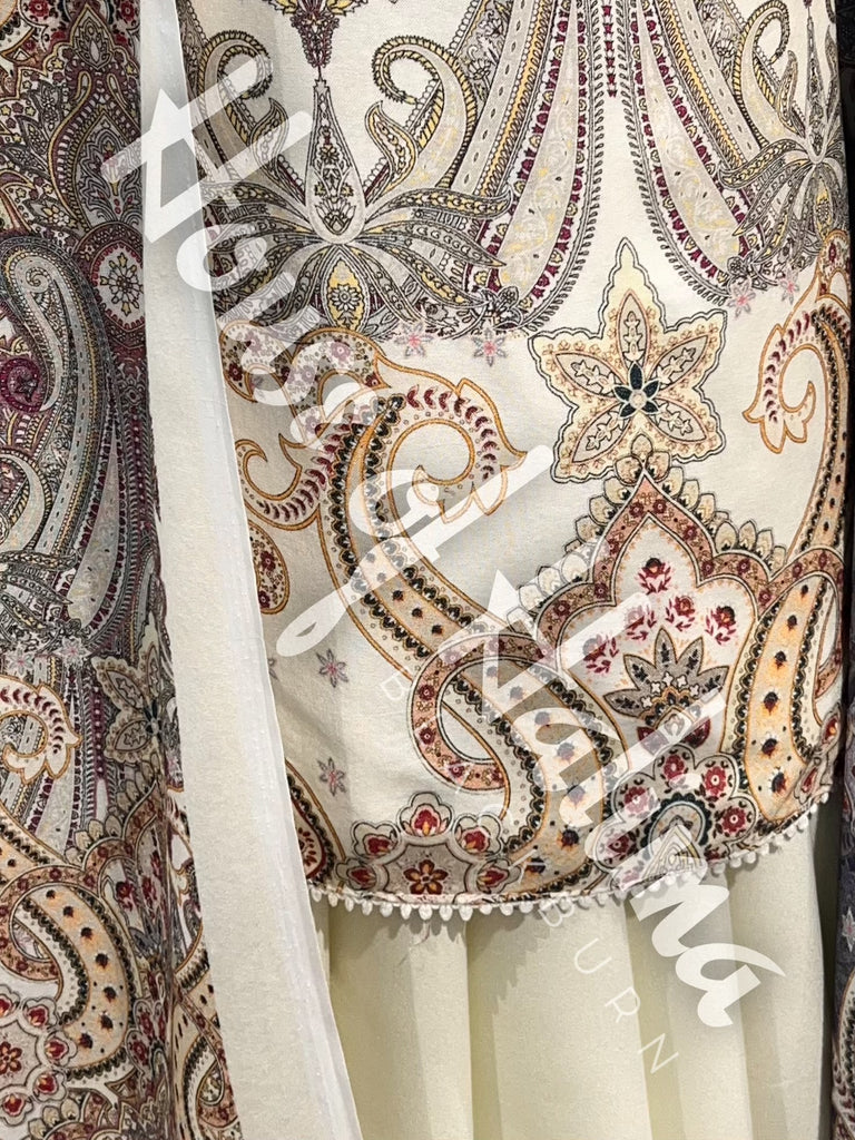 Winter alpine suits with paisley print and finishing border lace. Comes with printed alpine shawl.