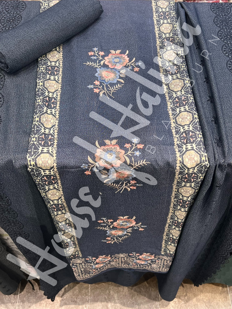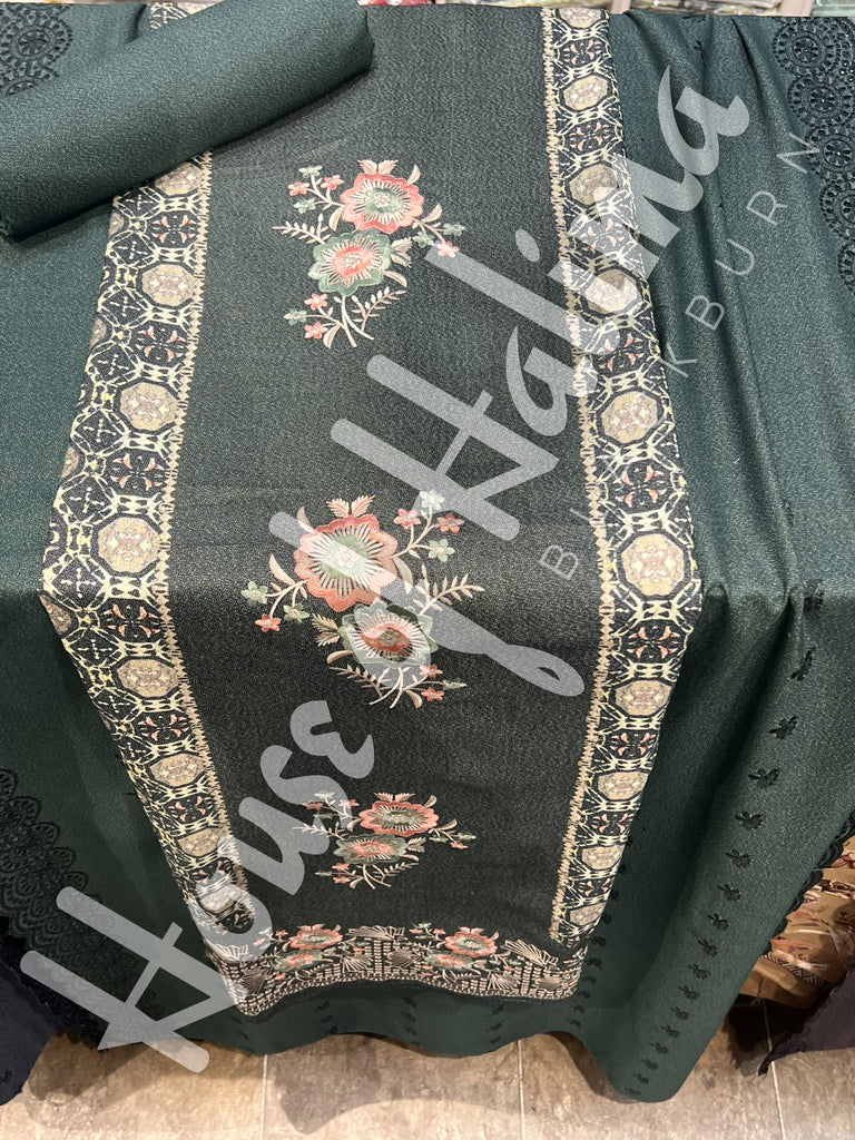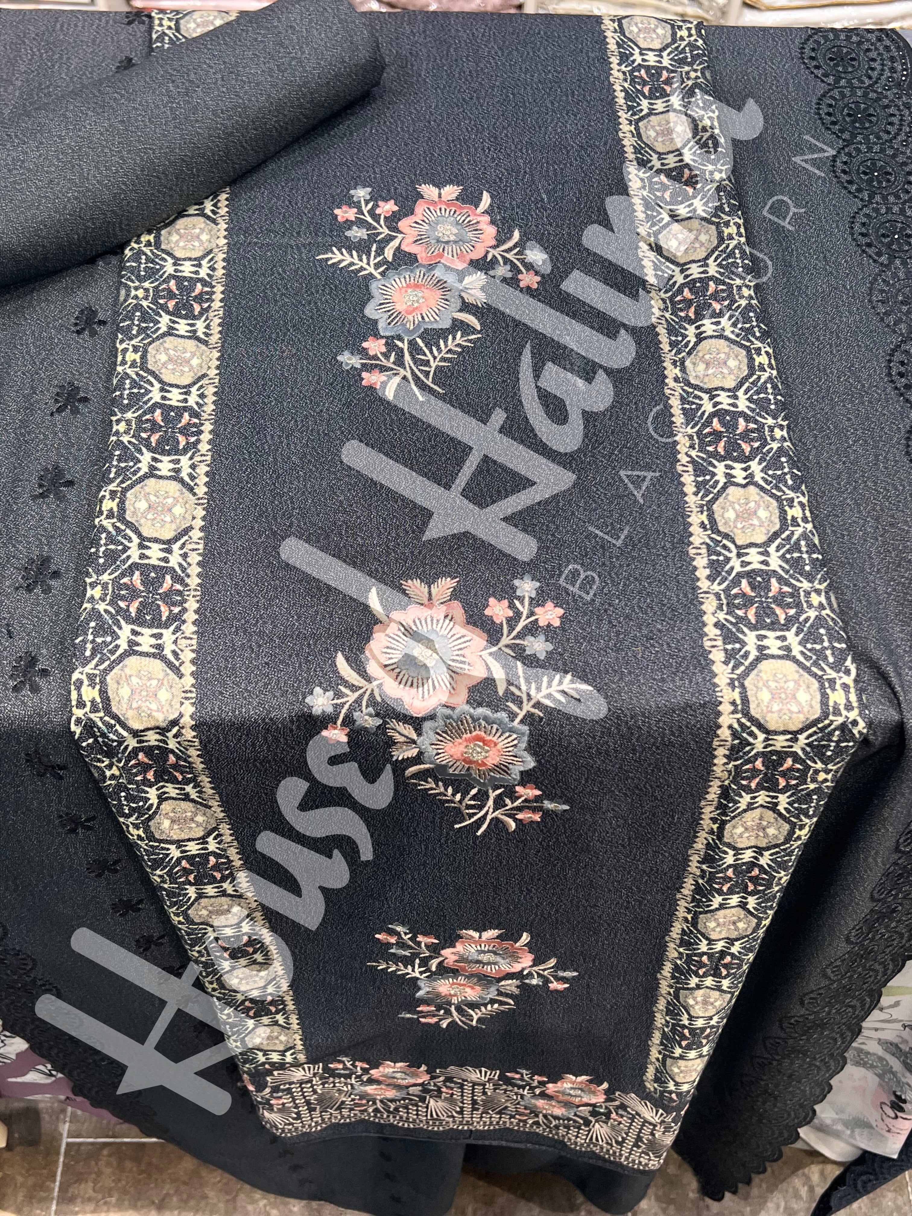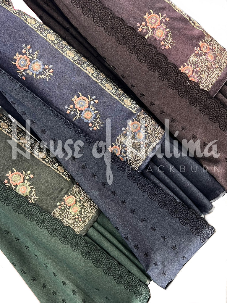 Autumn/winter alpine suits with embroidered panel design and embroidered alpine shawl.