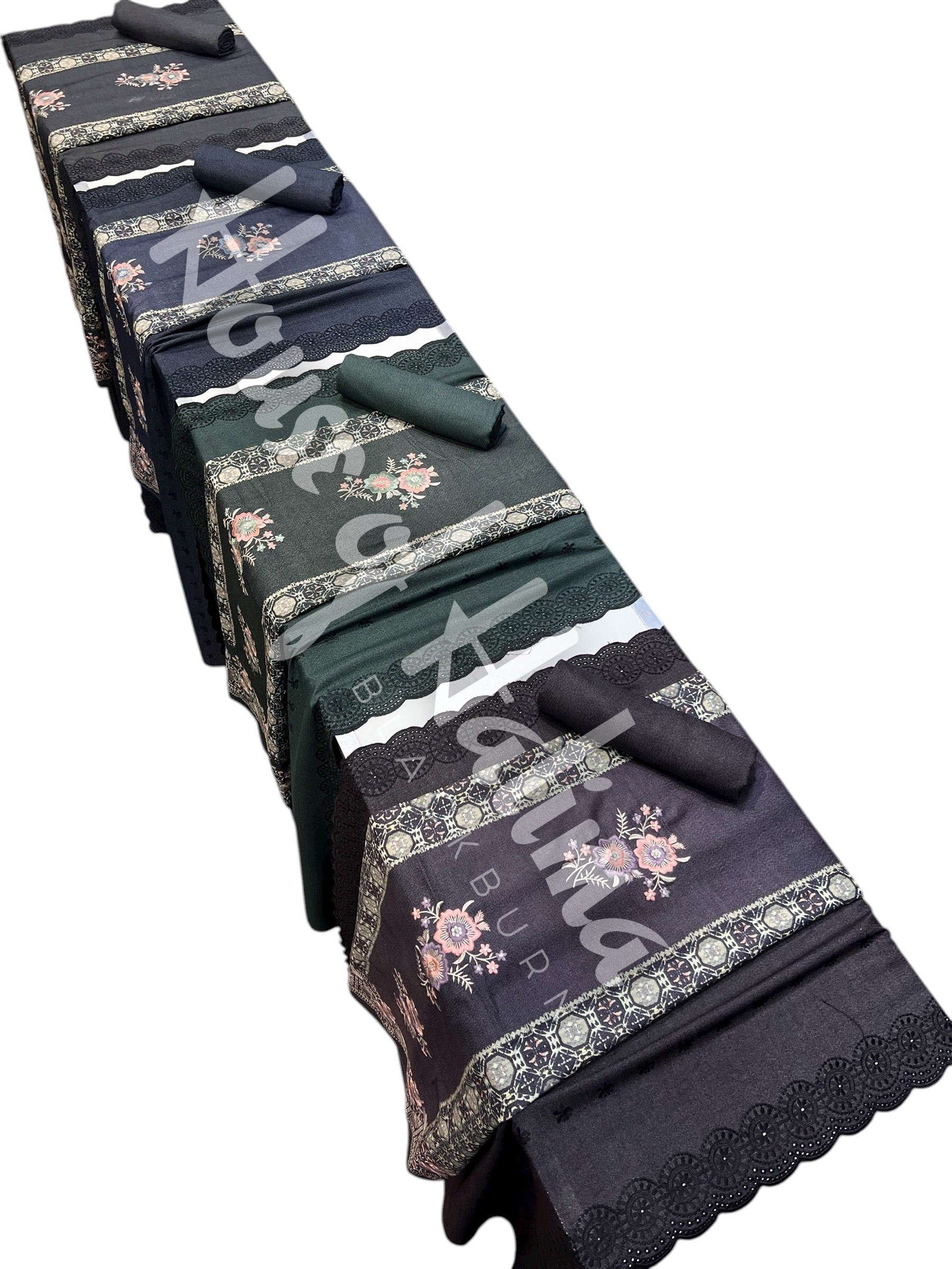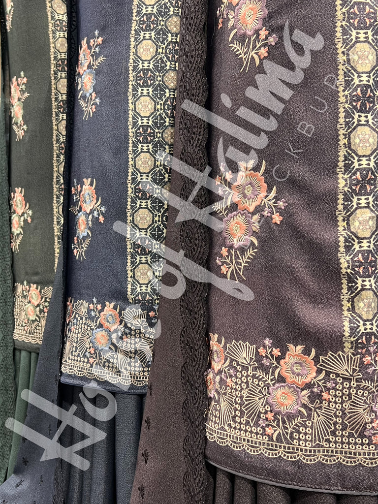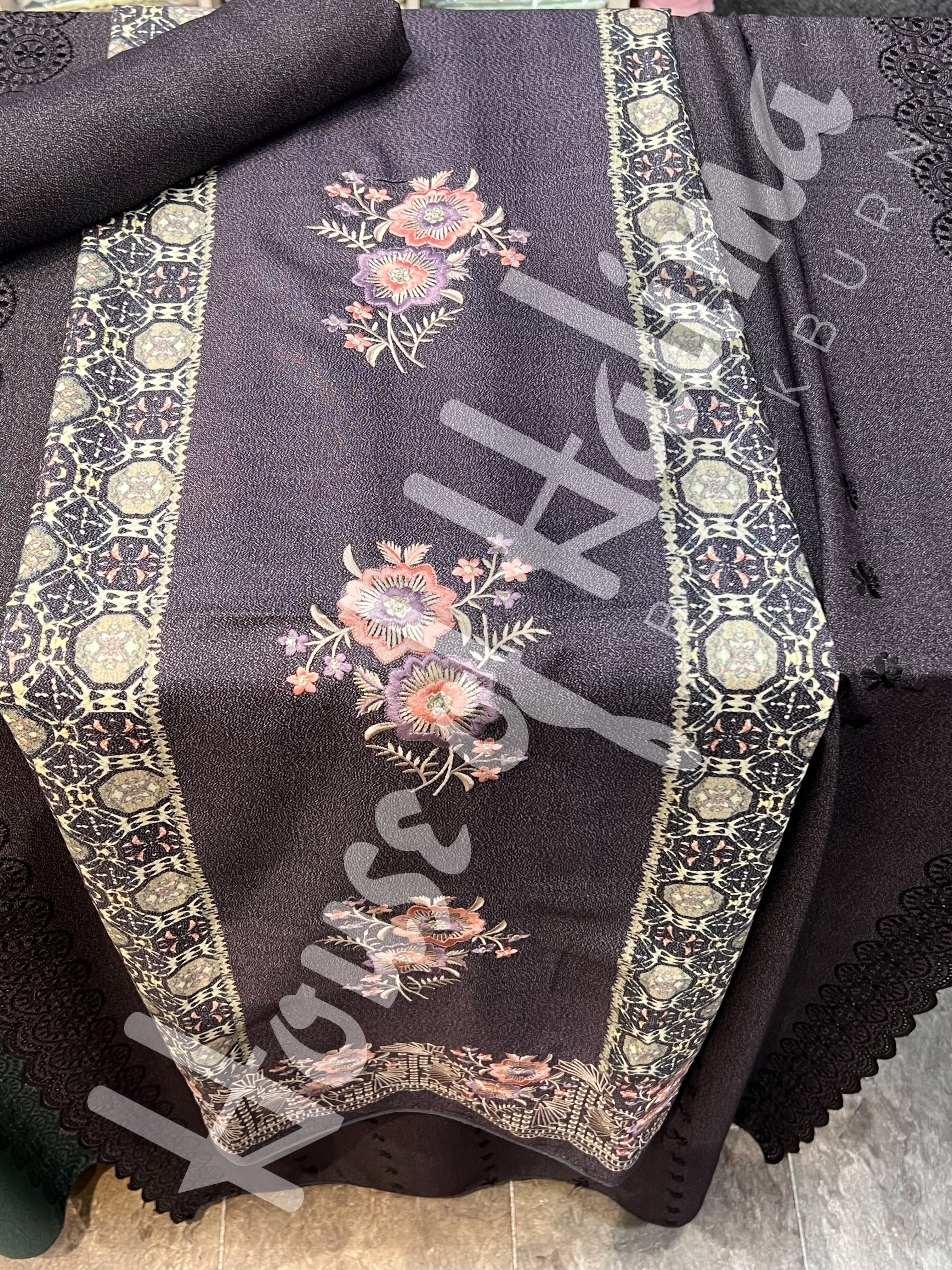 Autumn/winter alpine suits with embroidered panel design and embroidered alpine shawl.