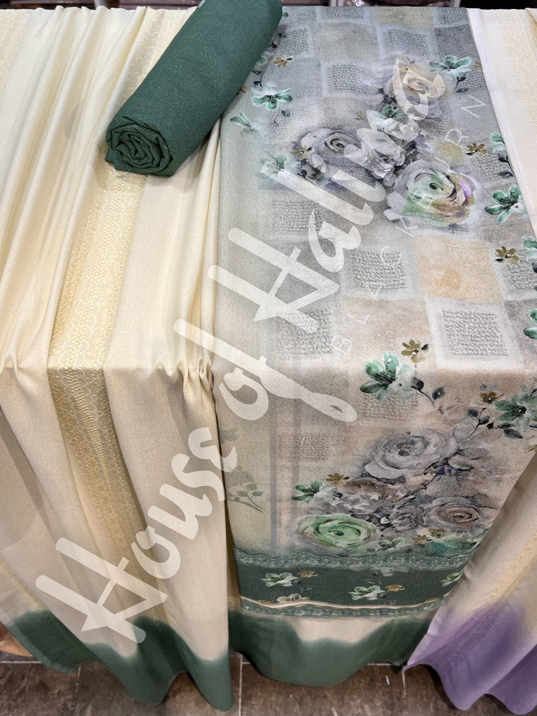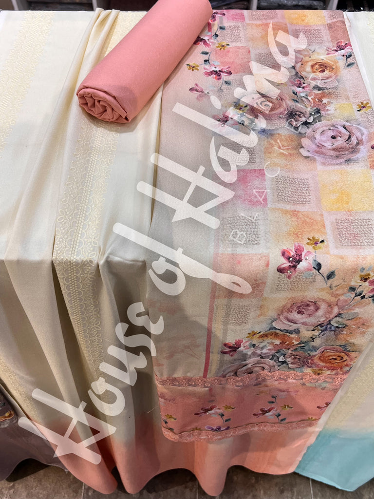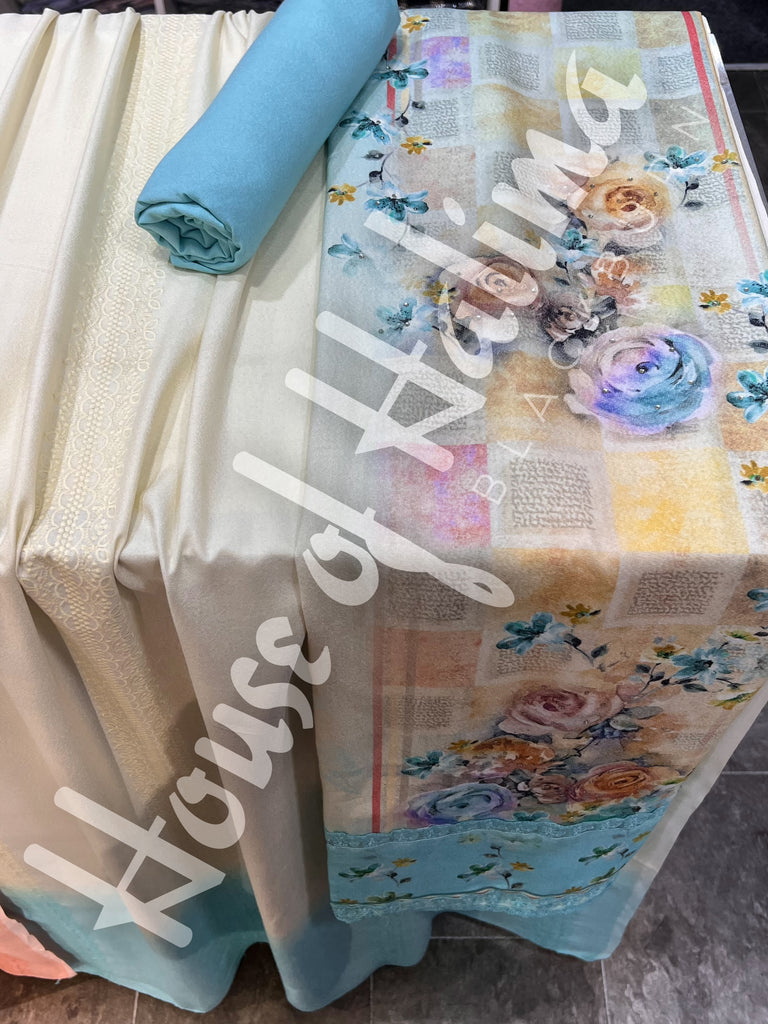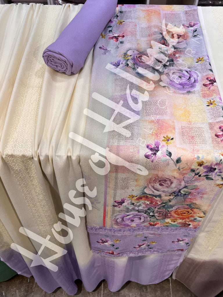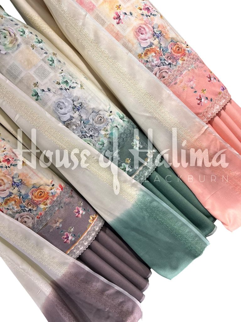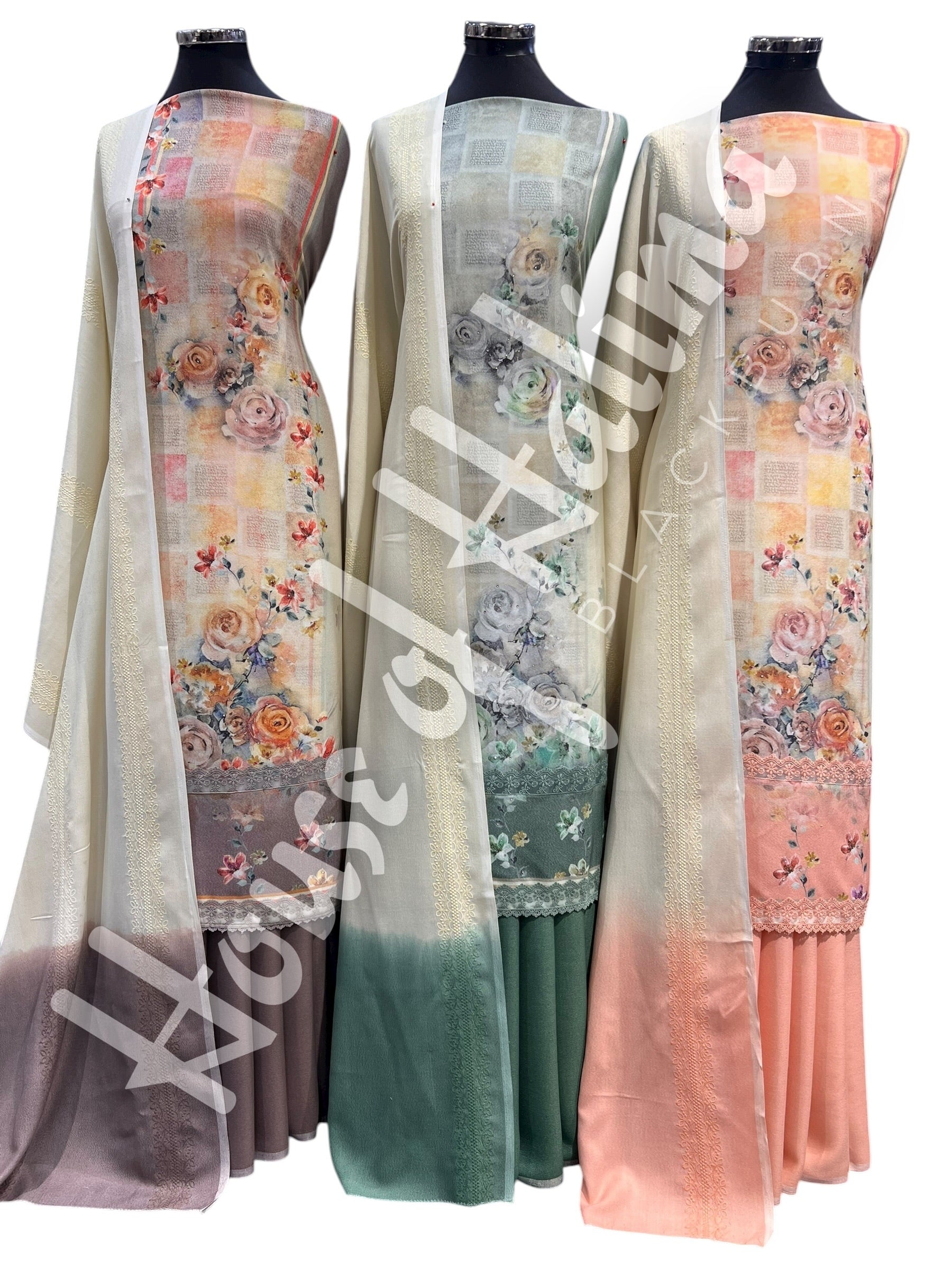 Winter alpine suits with digital floral print and diamonte embellishments. Comes with embroidered alpine shawl.