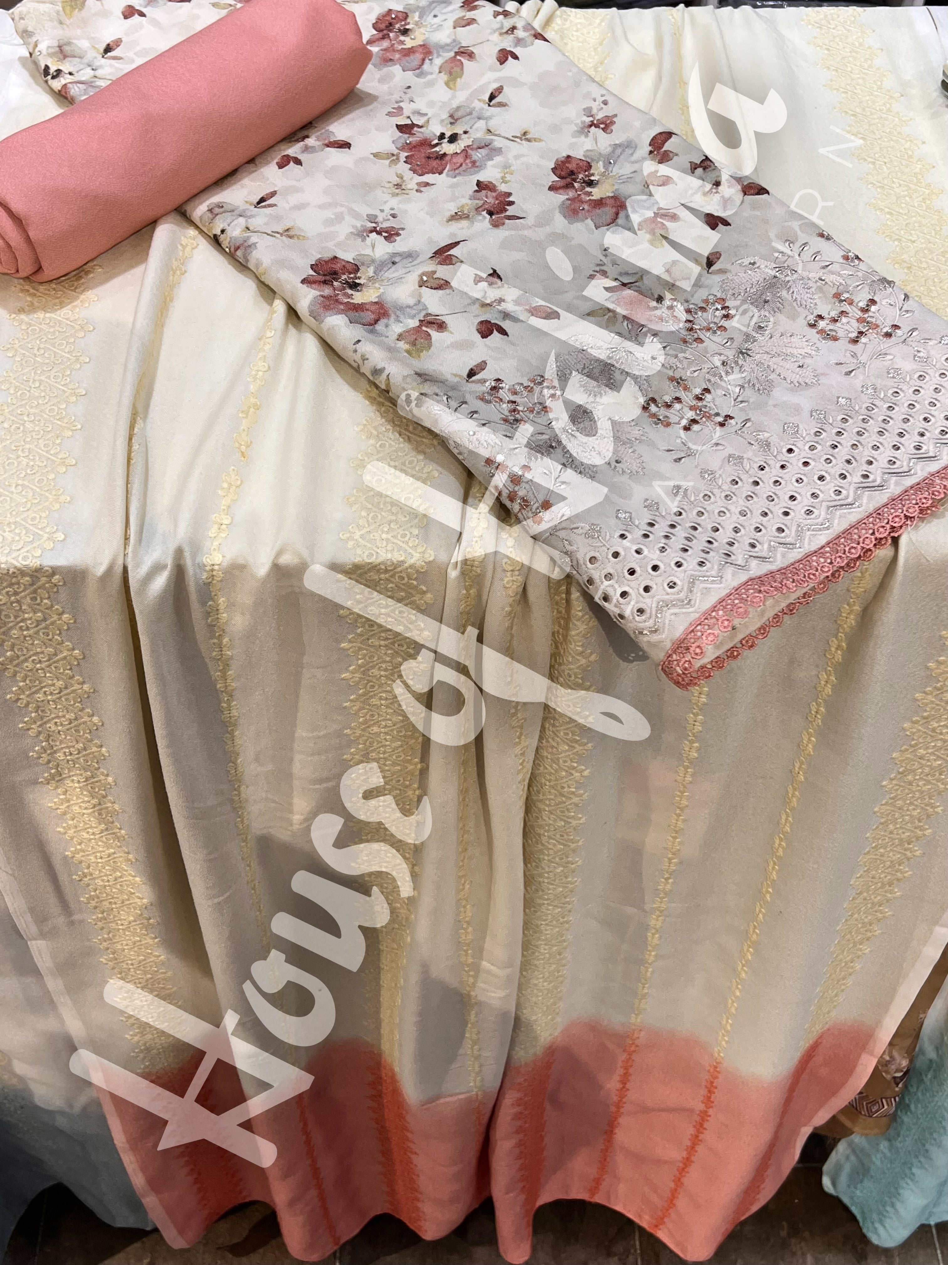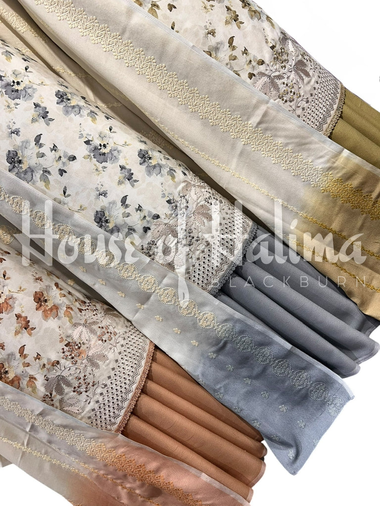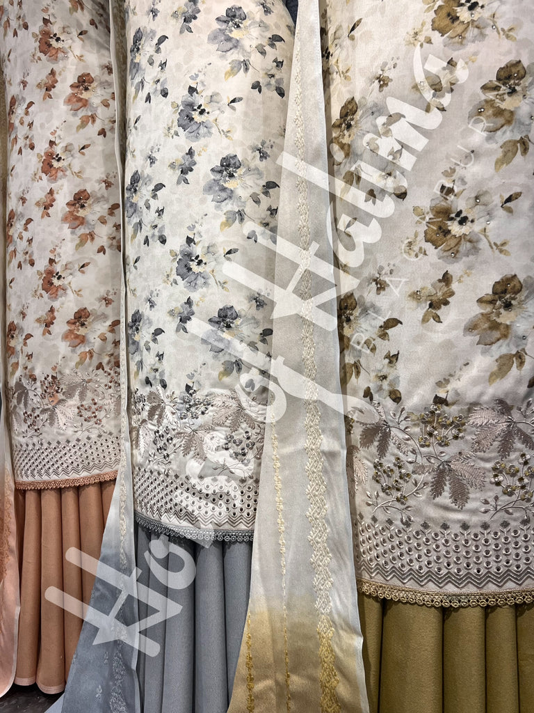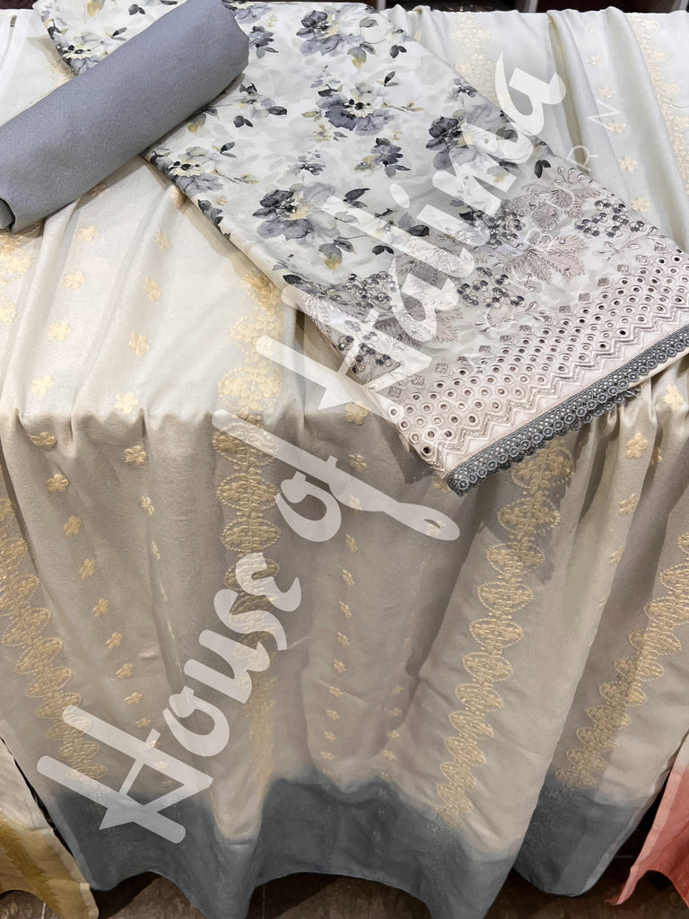 Winter alpine suits with floral print and border embroidery. Comes with embroidered alpine shawl.