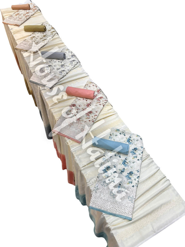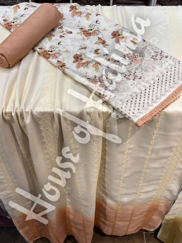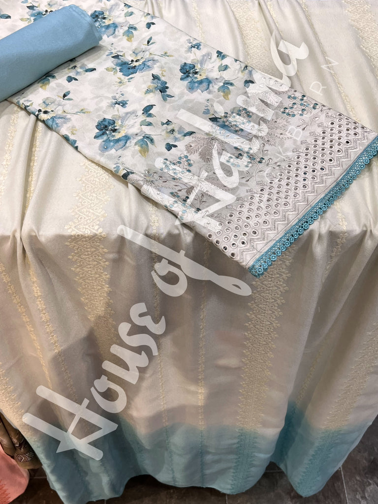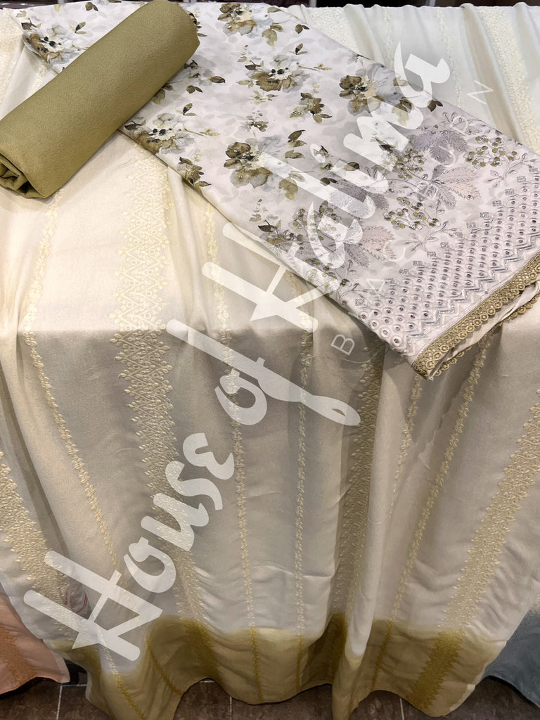 Winter alpine suits with floral print and border embroidery. Comes with embroidered alpine shawl.