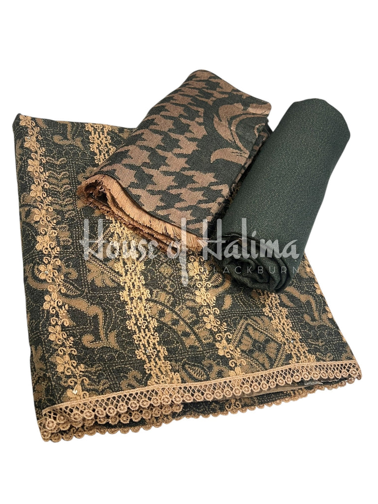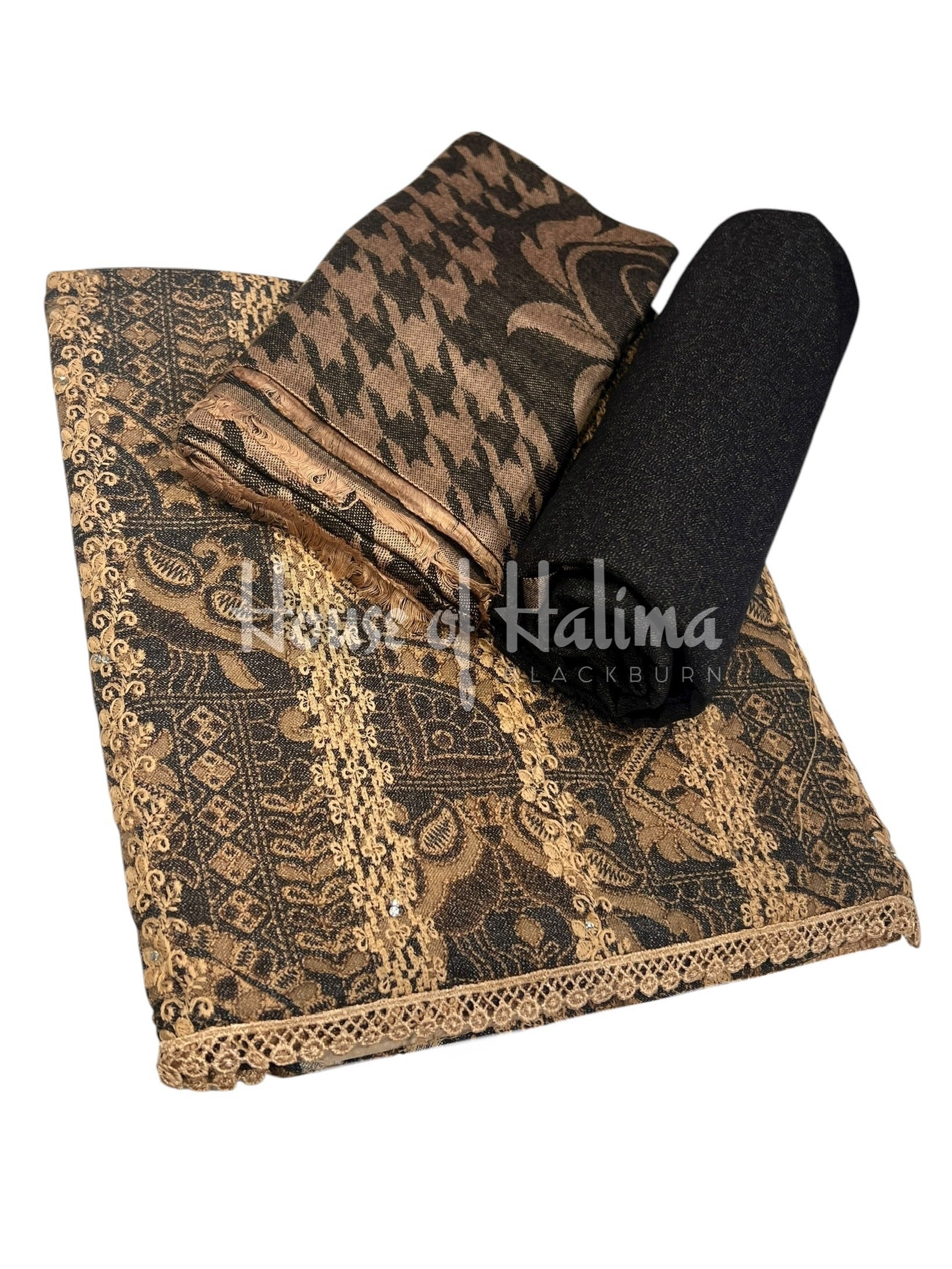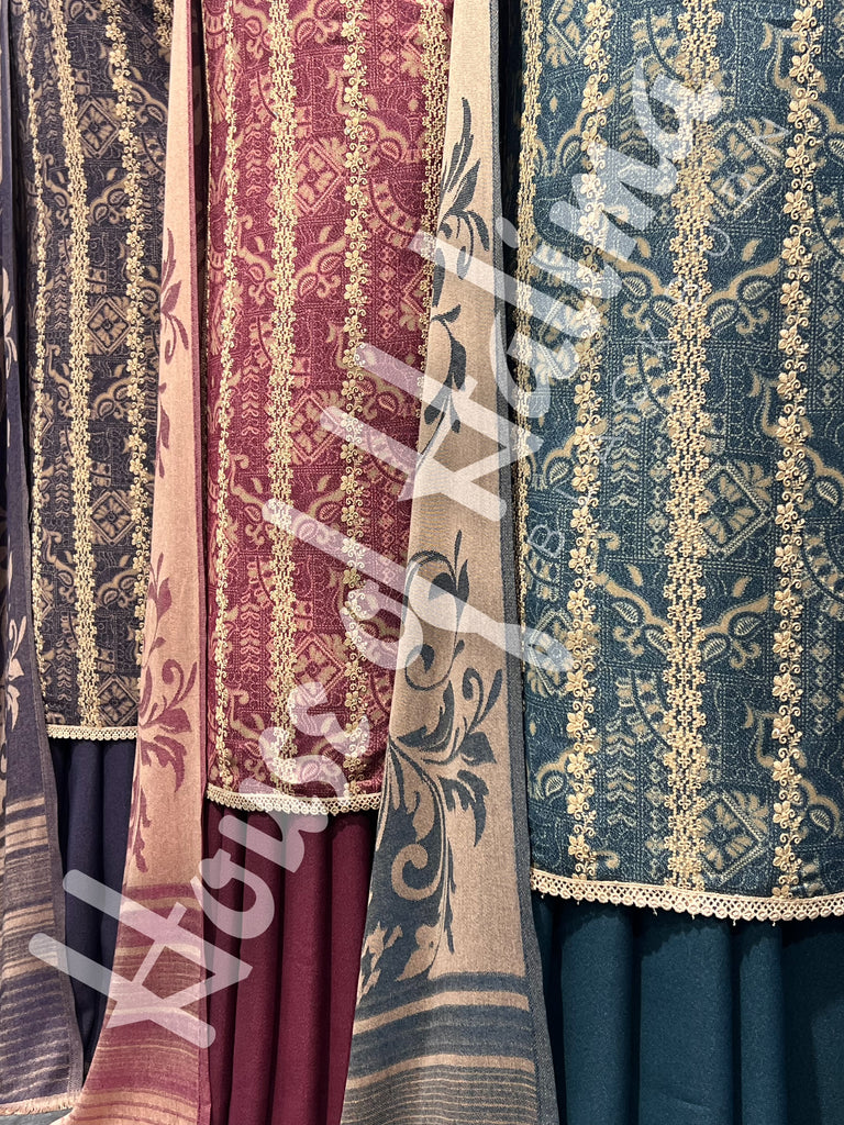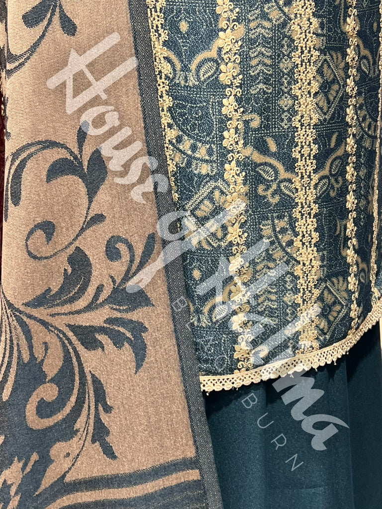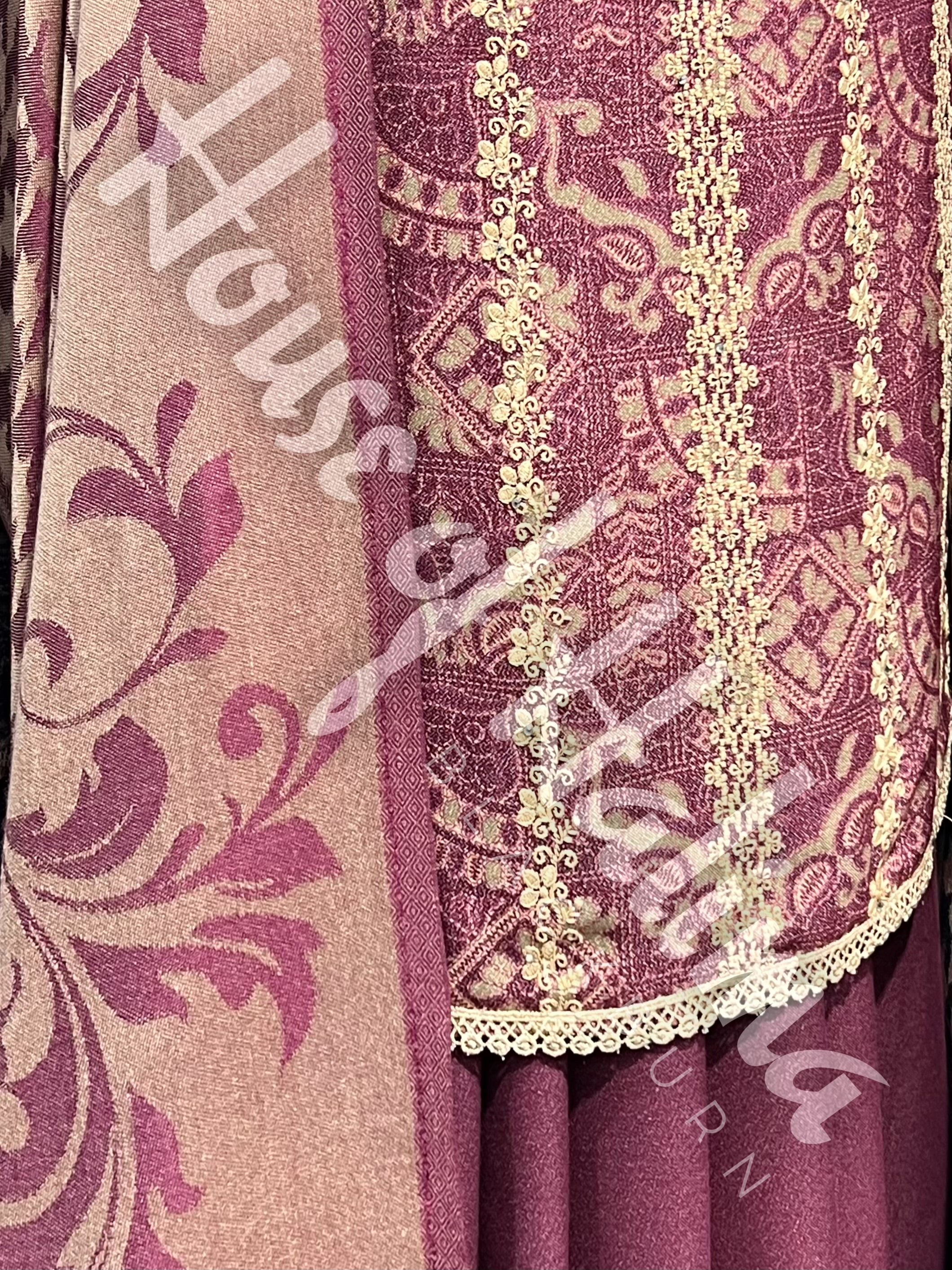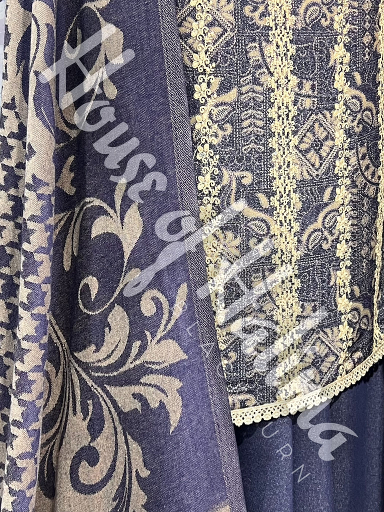 Embroidered alpine suits with full front & back embroidery. Comes with contrasting jacquard alpine shawl.