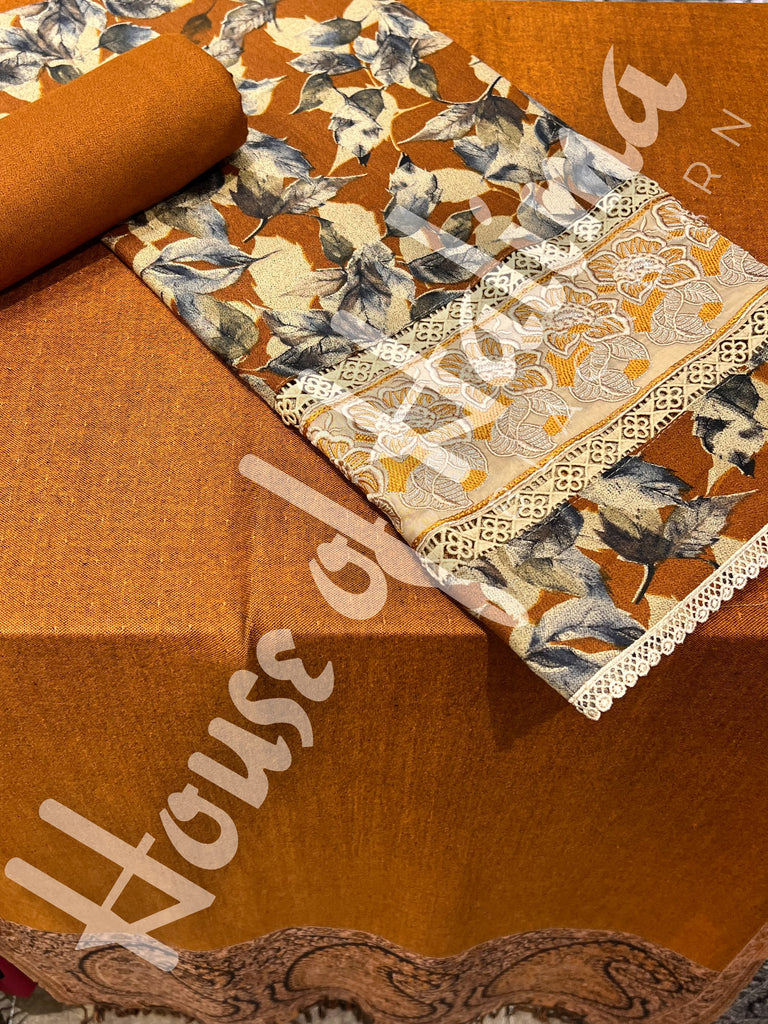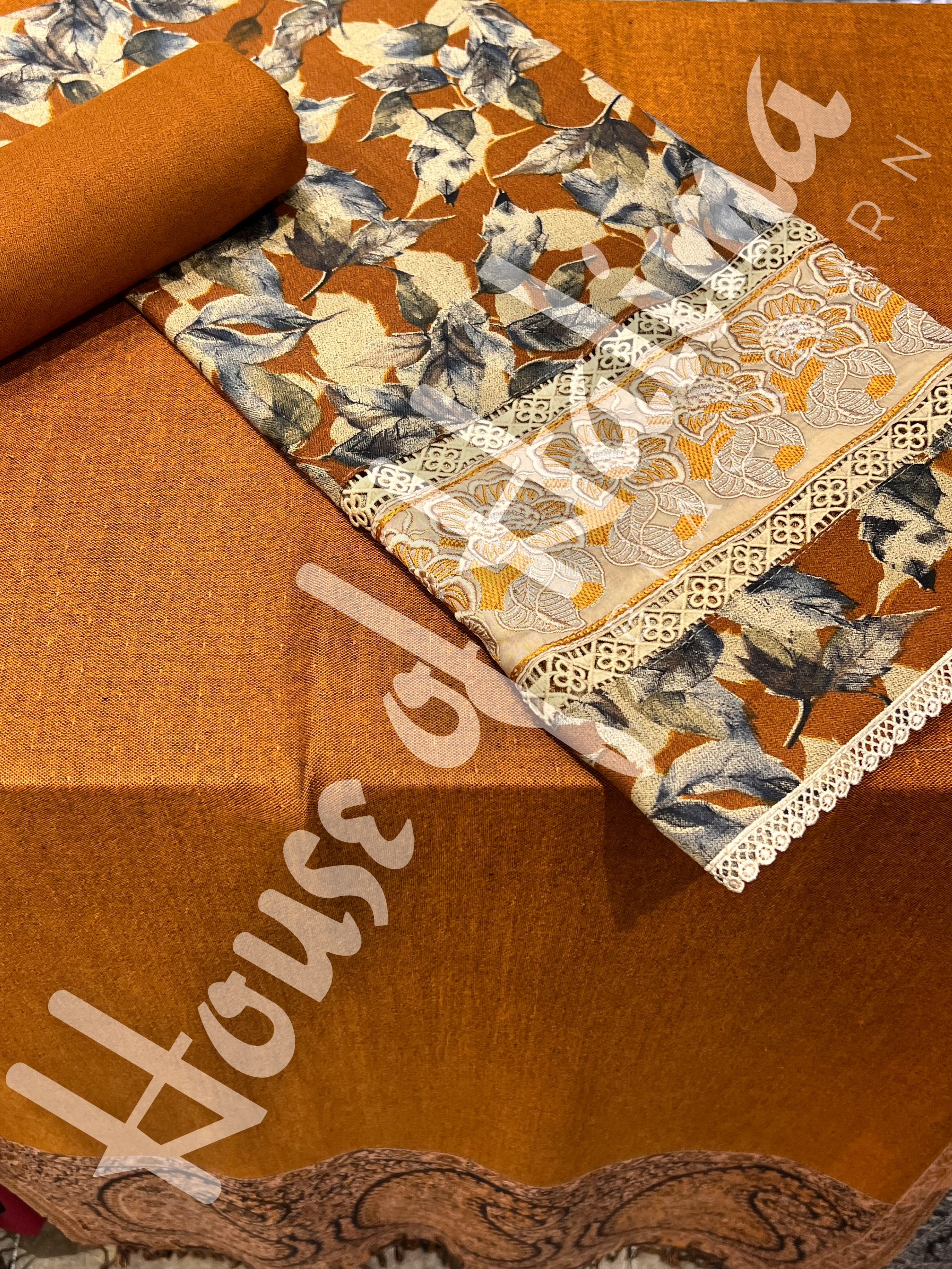 Autumn/winter alpine suits with embroidered panel design and contrasting warm shawl.