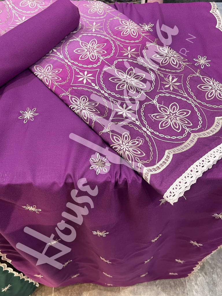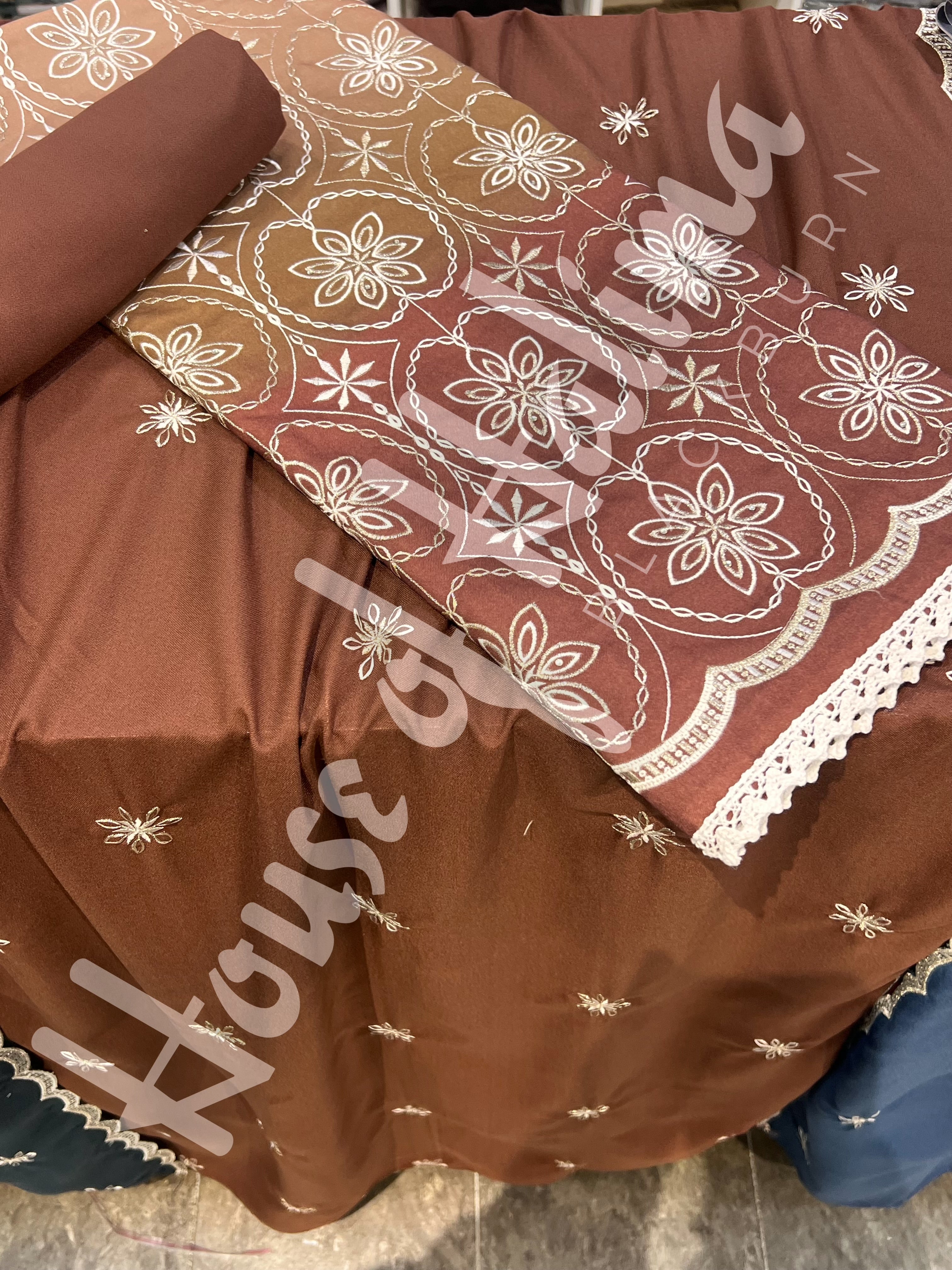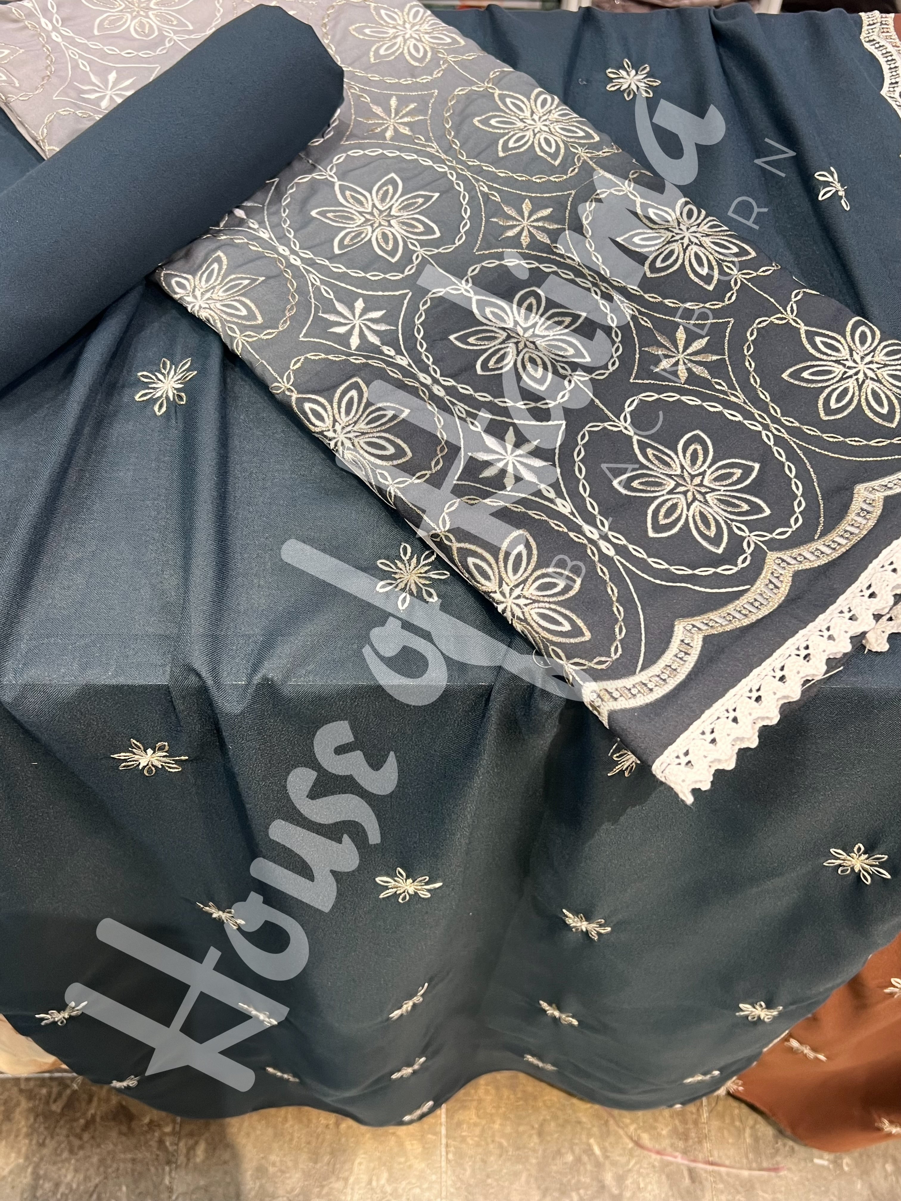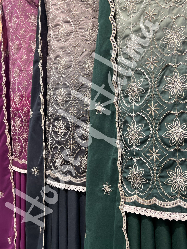 Winter alpine suits with allover embroidery on front of kameez and finishing border lace. Comes with embroidered alpine shawl.