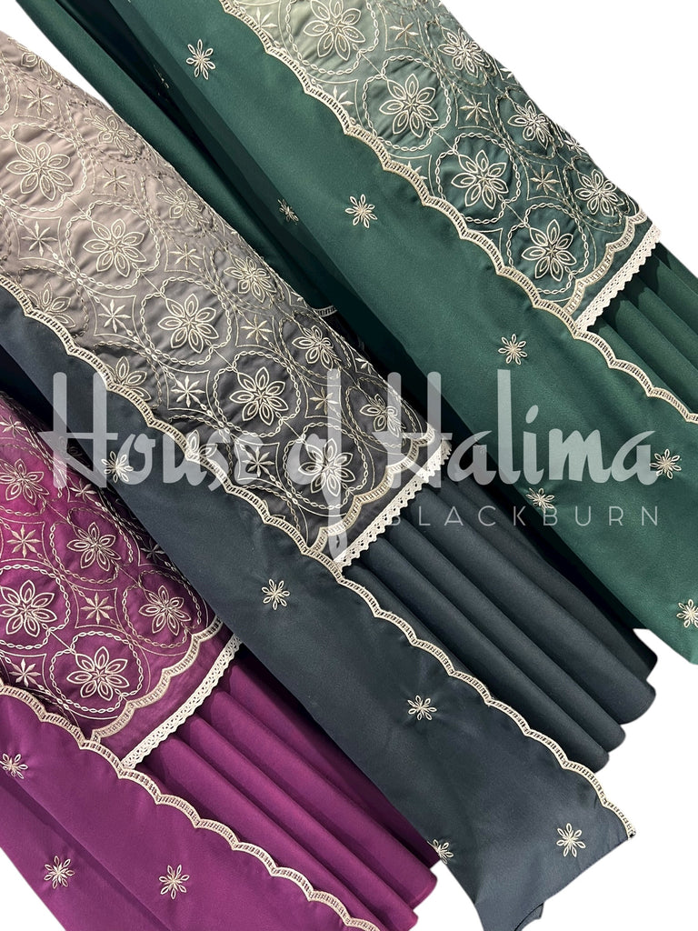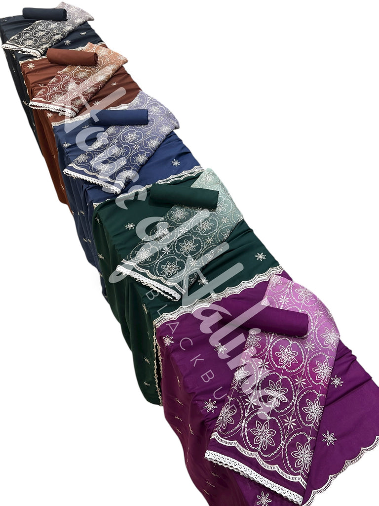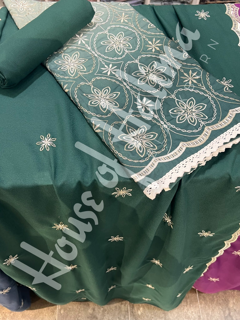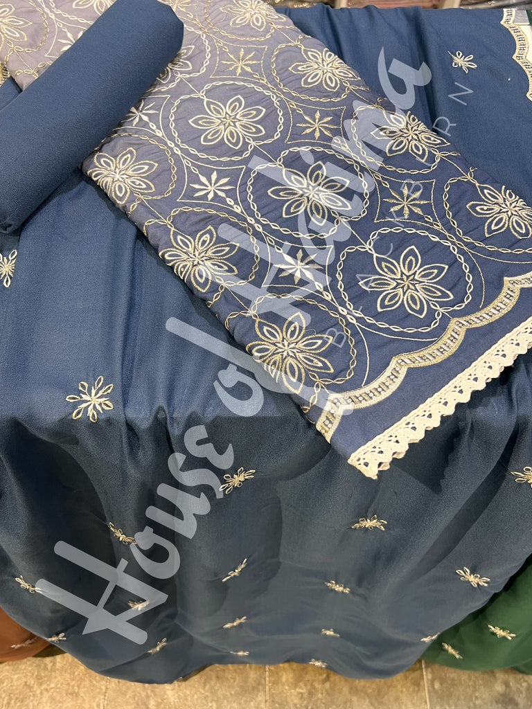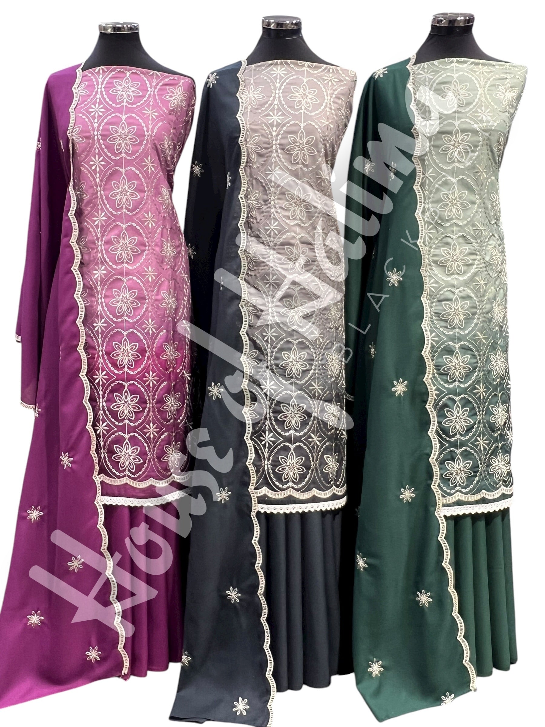 Winter alpine suits with allover embroidery on front of kameez and finishing border lace. Comes with embroidered alpine shawl.