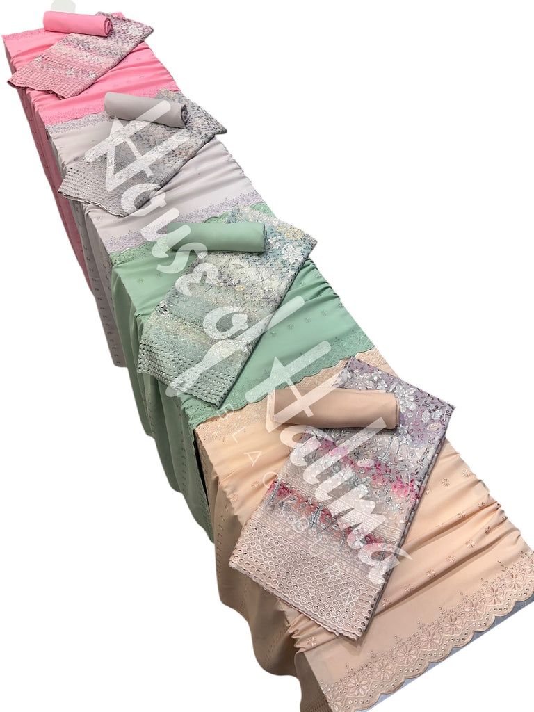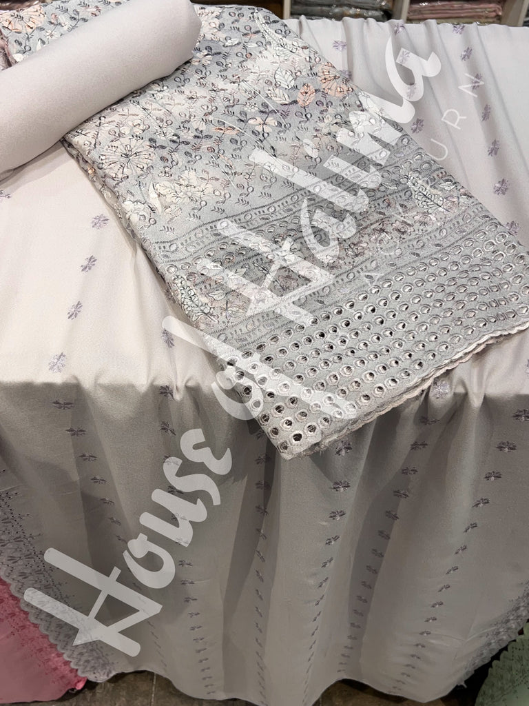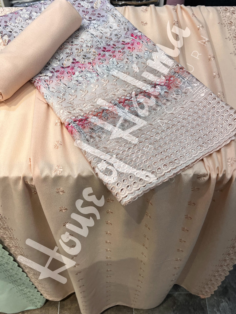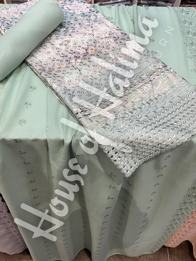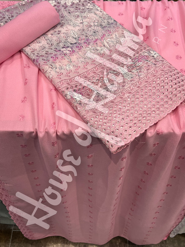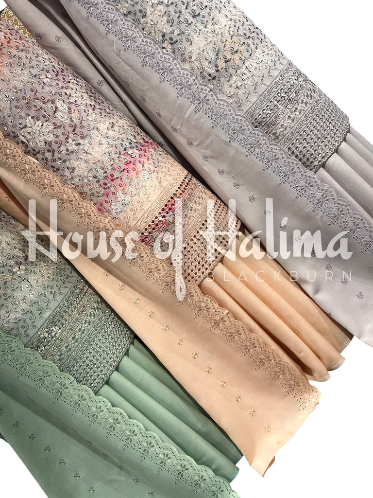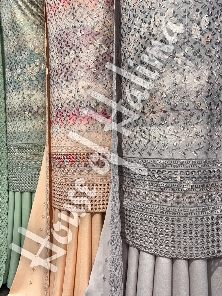 Chikankari alpine suits with full front and back embroidery and cutwork border. Comes with embroidered alpine shawl.