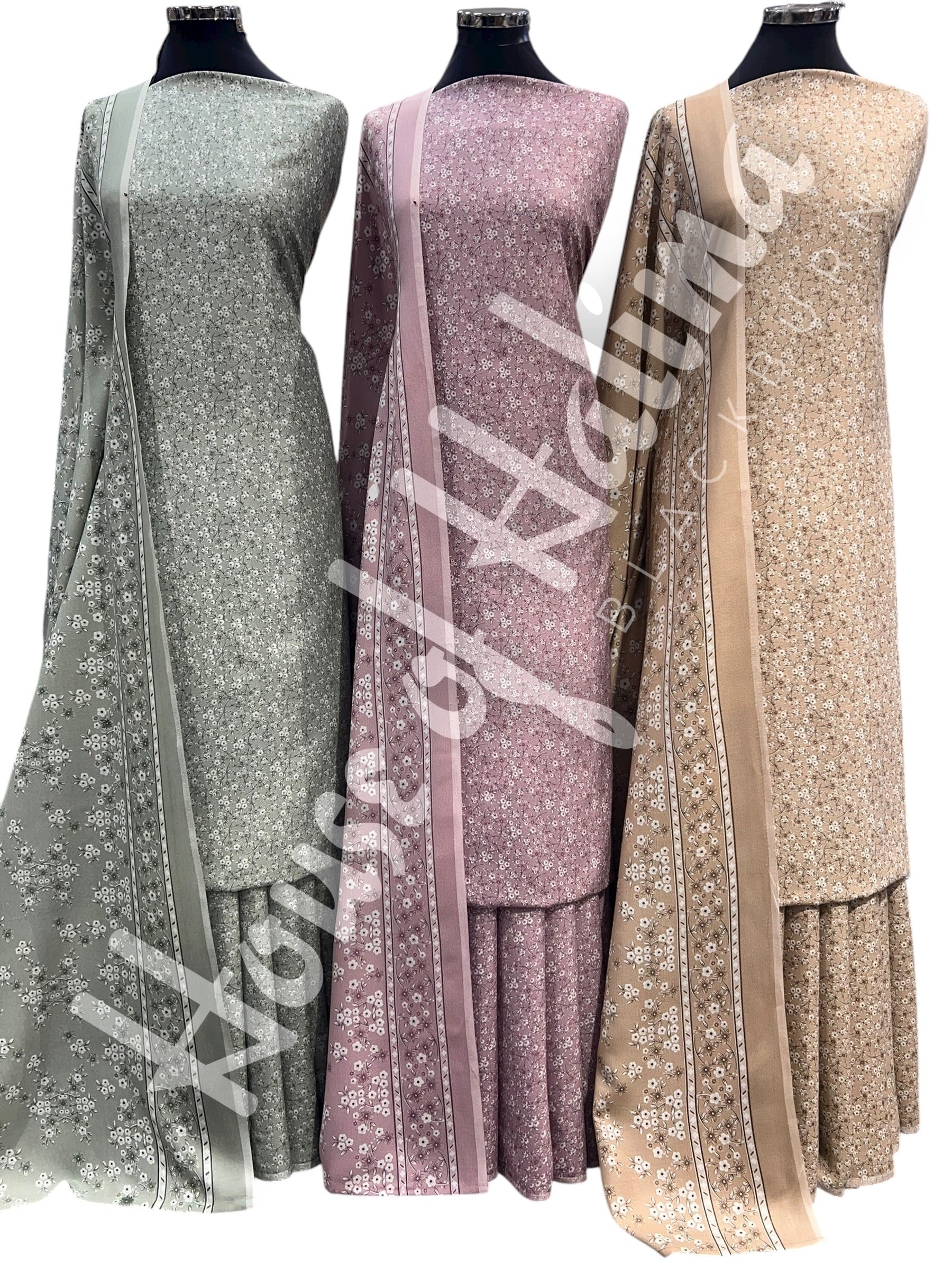 Winter alpine suits with paisley print and finishing border lace. Comes with printed alpine shawl.