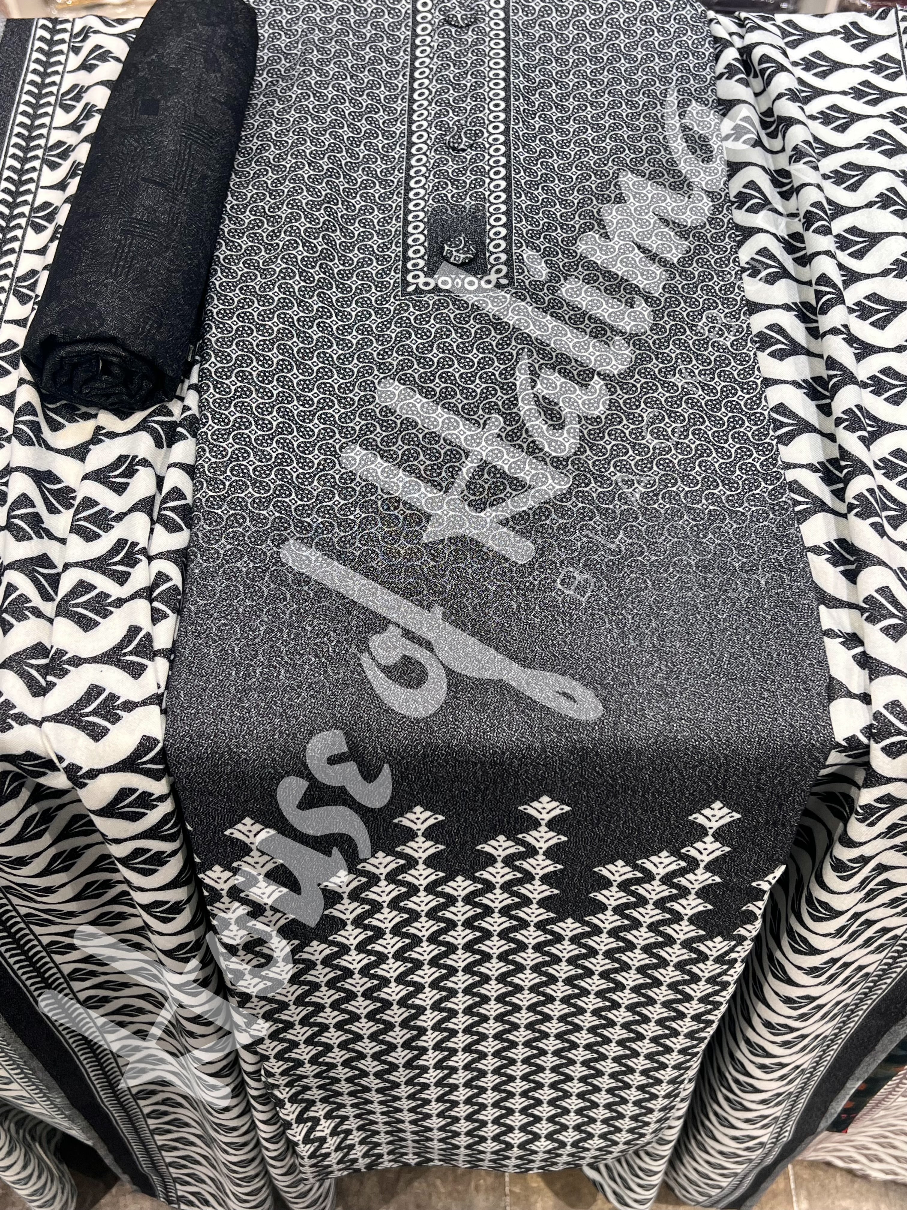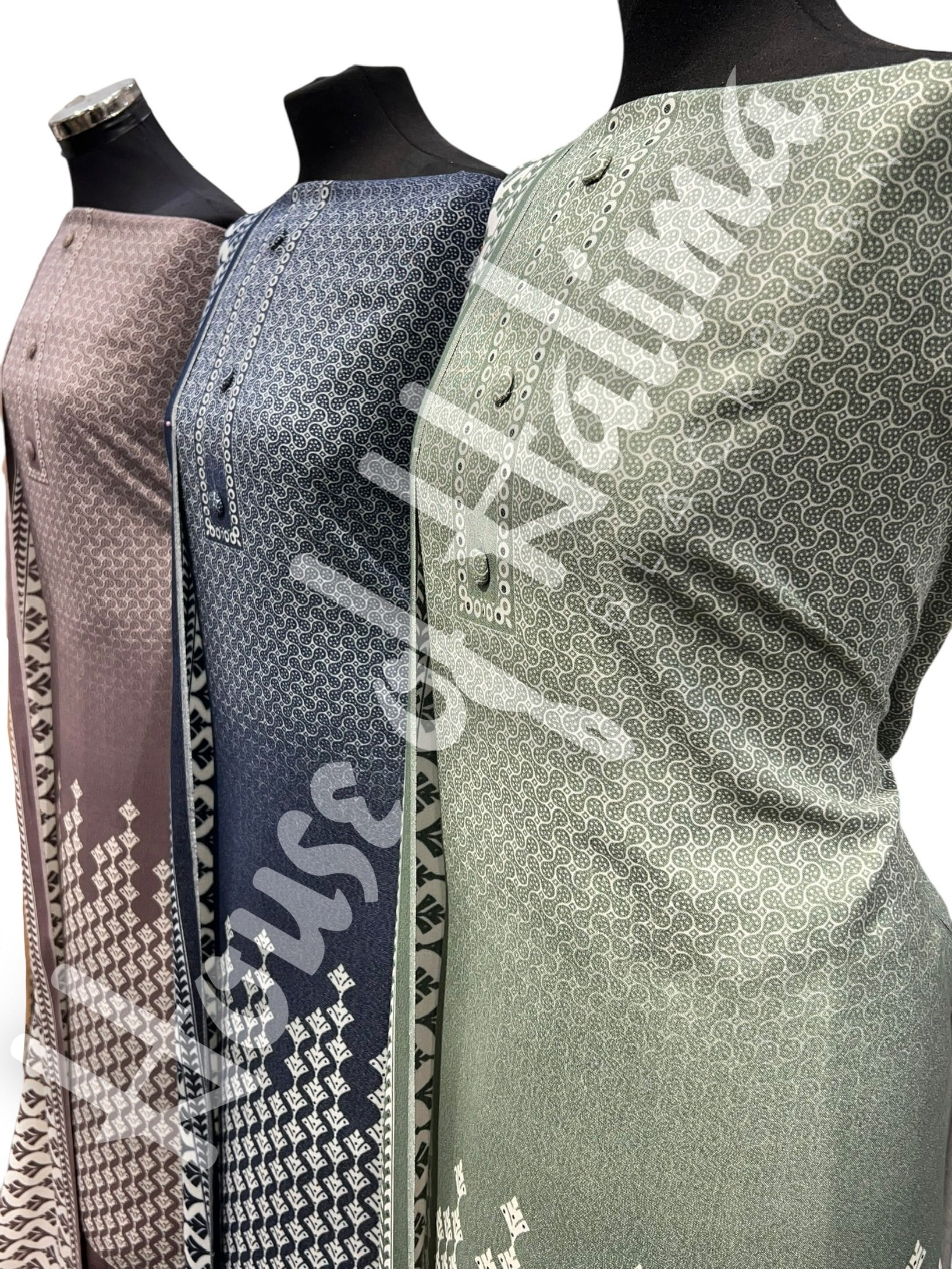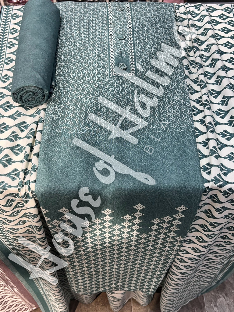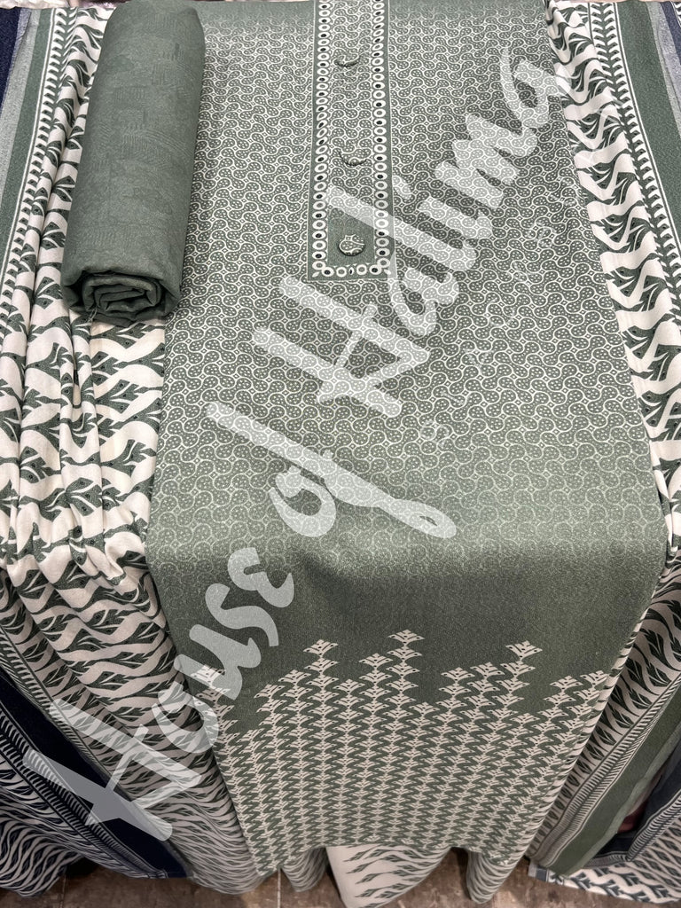 Printed alpine suits with button detailing, accompanied with a printed alpine shawl.