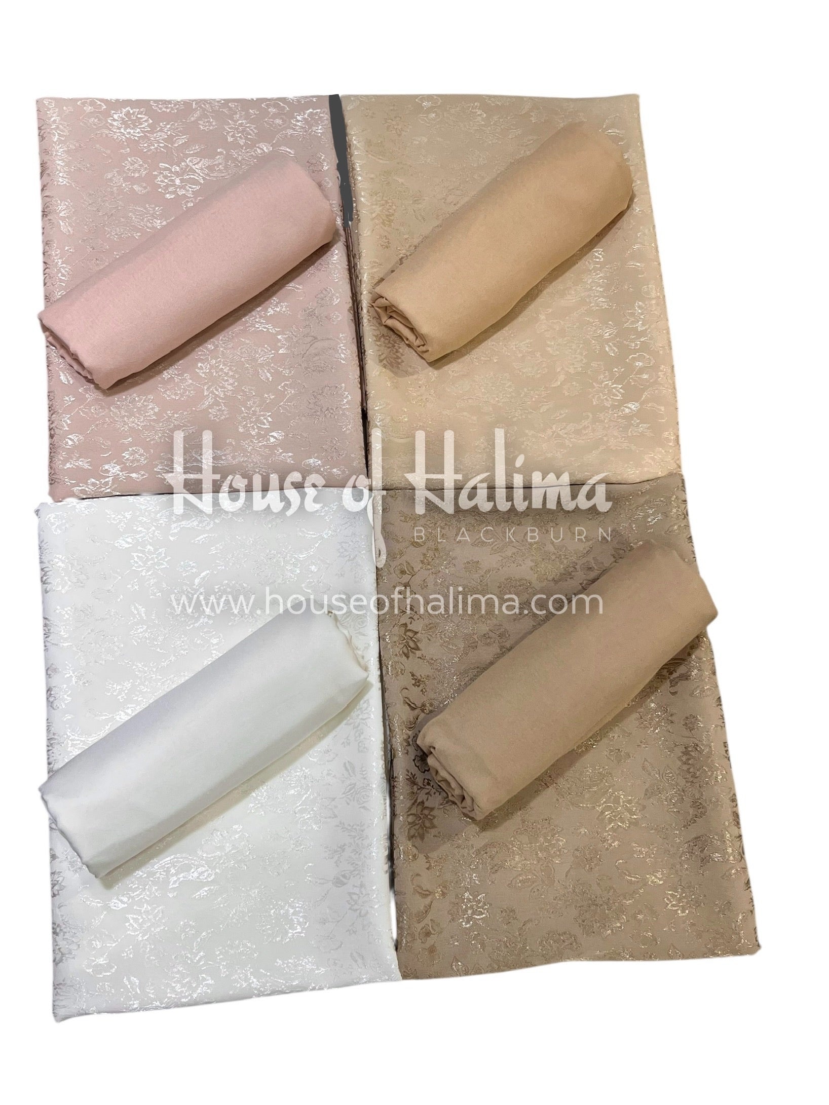 Self-print satin jacquard print in four pastel shades with matching alpine plain matching.