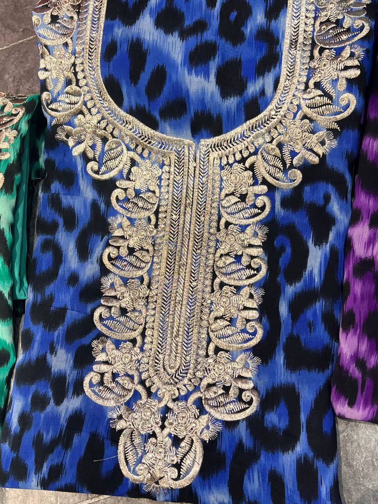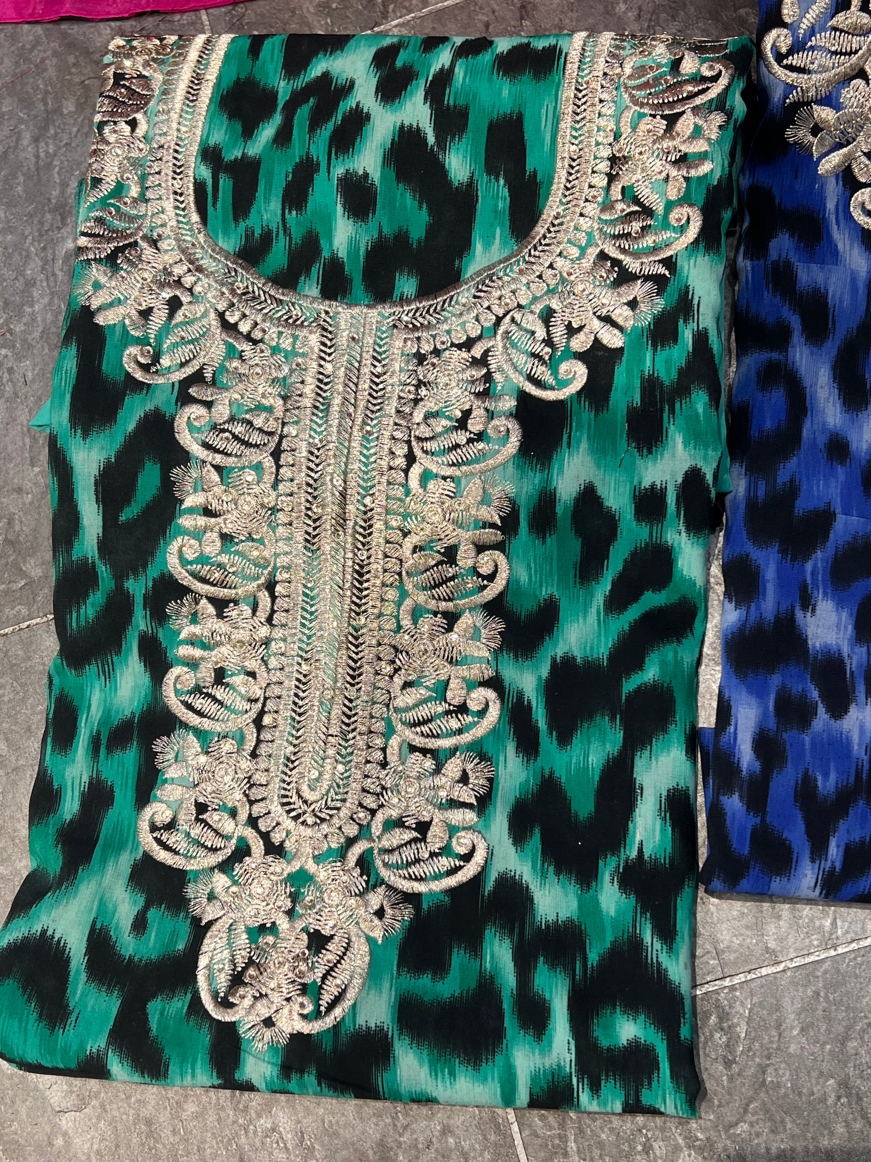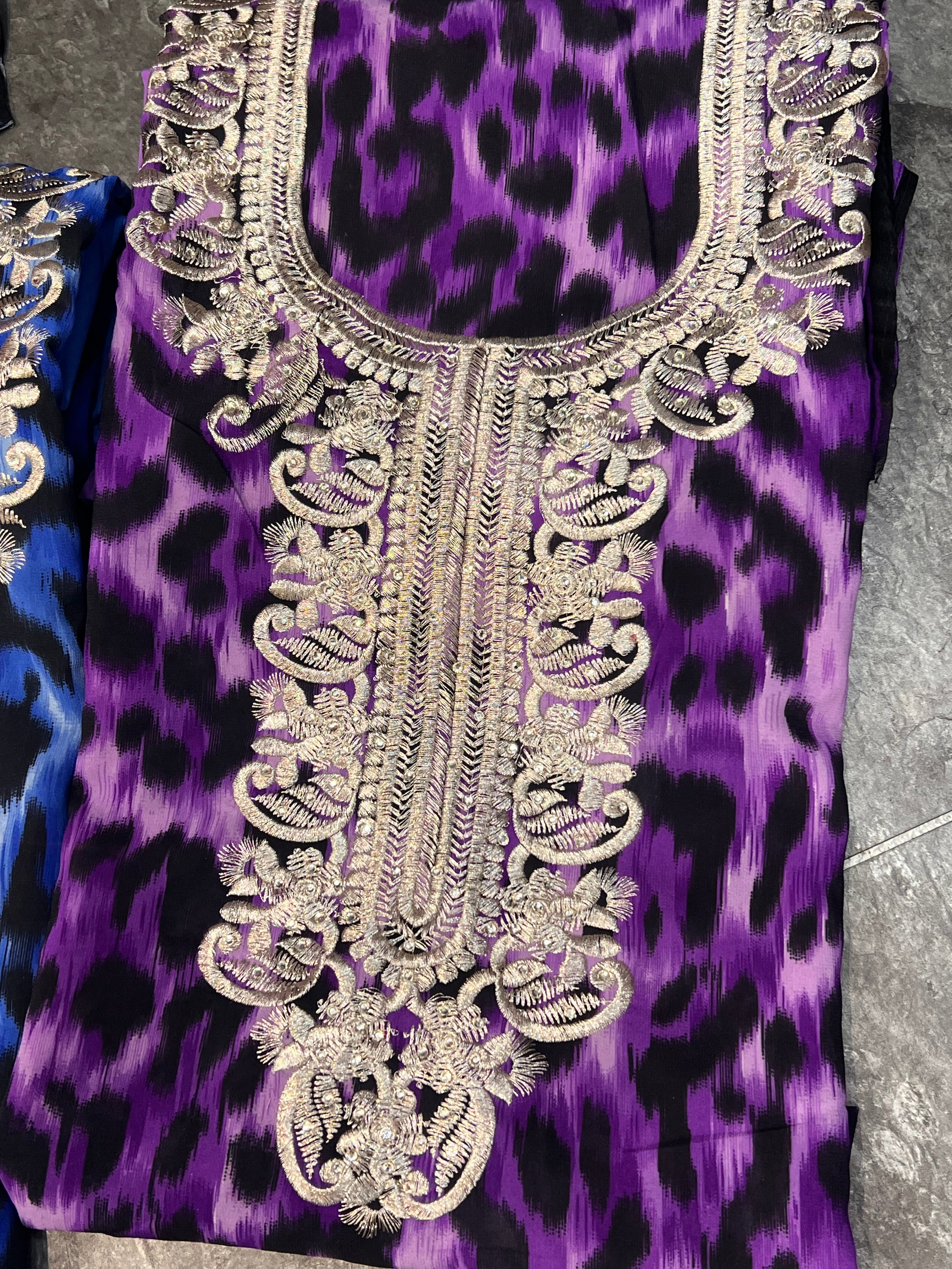 3pc leopard printed georgette suits with thread embroidery on neckline and diamonte embellishements. Comes with printsd georgette dupatta.