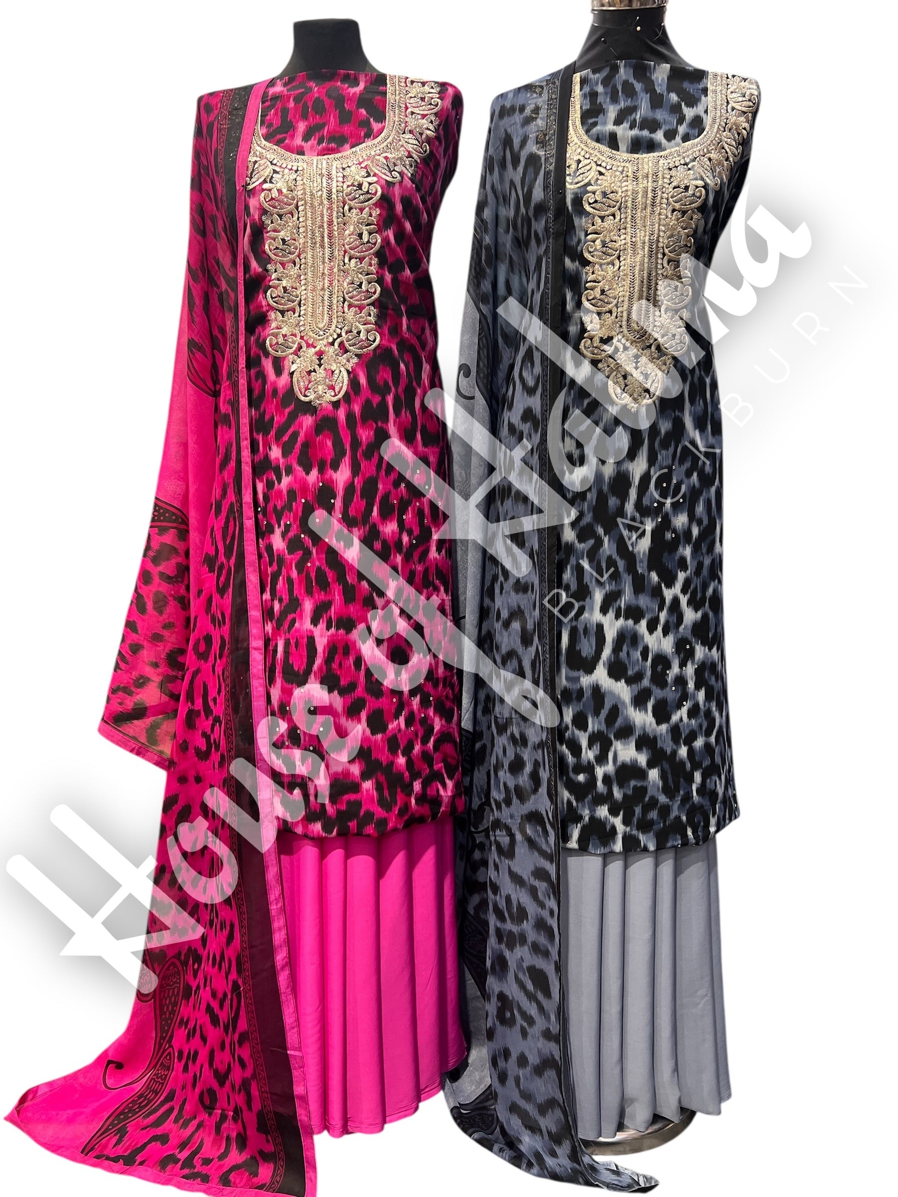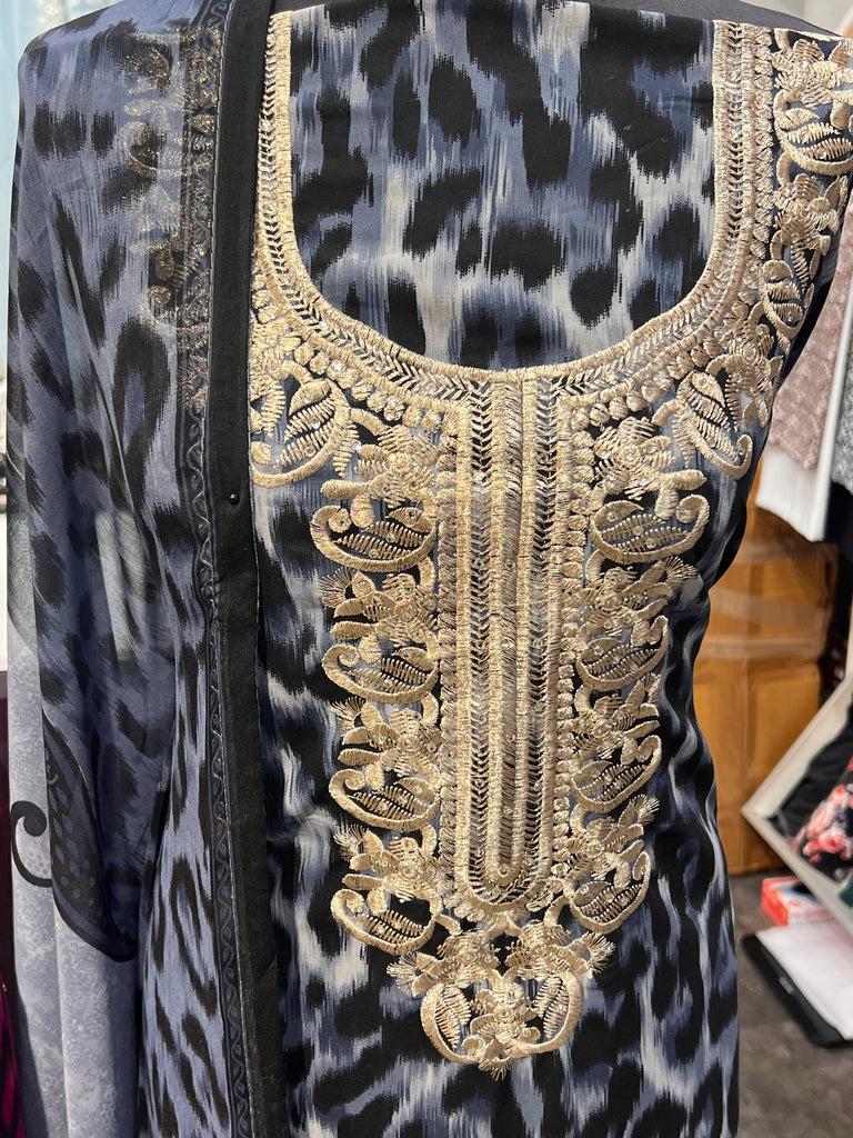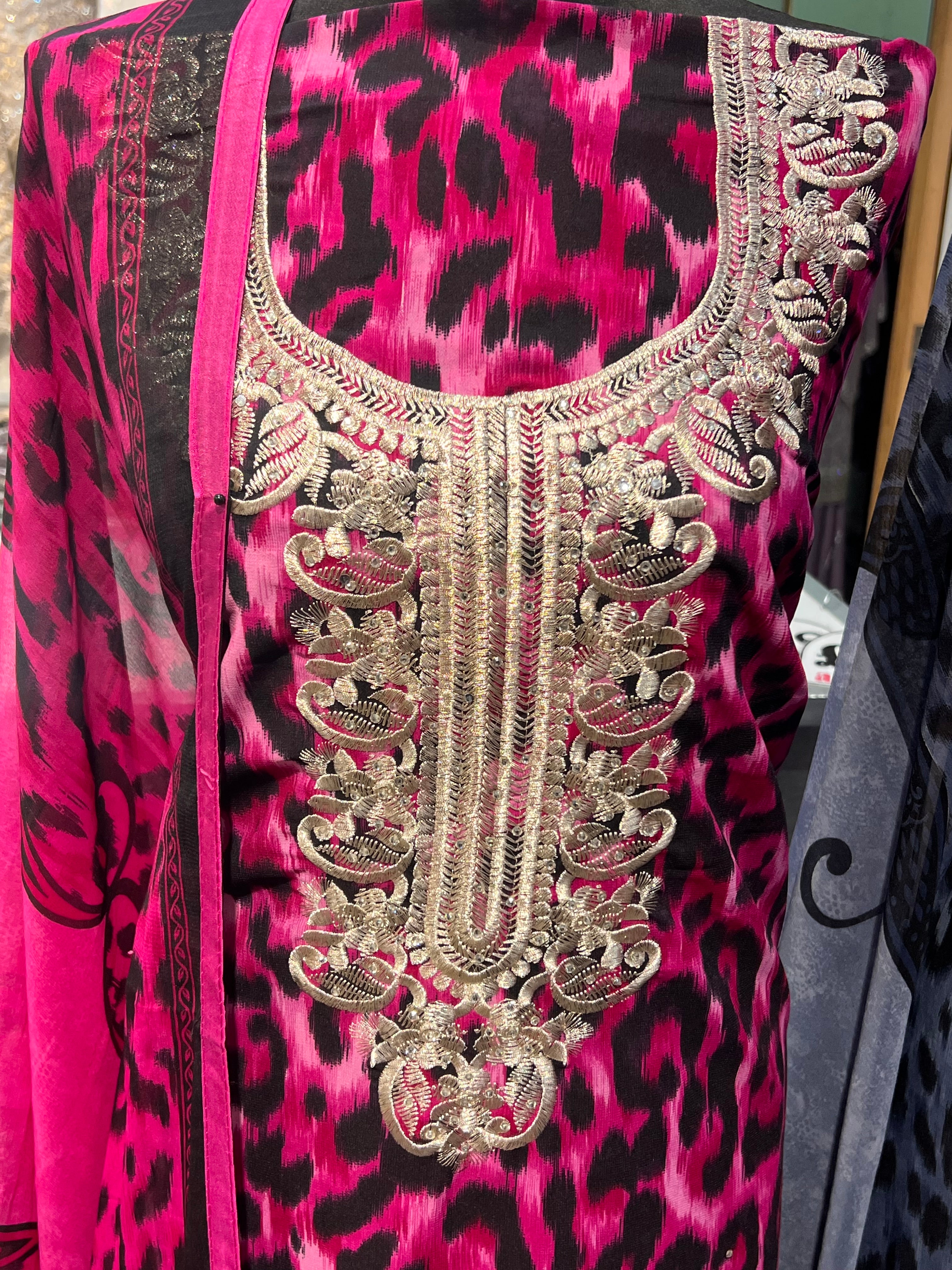 3pc leopard printed georgette suits with thread embroidery on neckline and diamonte embellishements. Comes with printsd georgette dupatta.