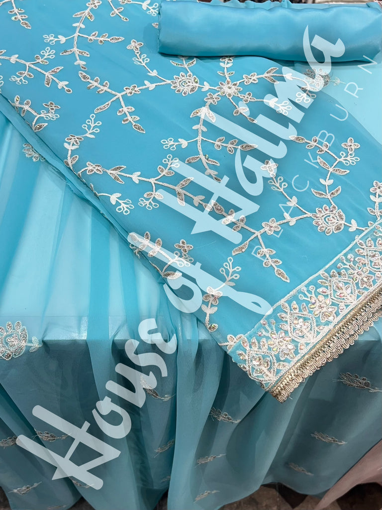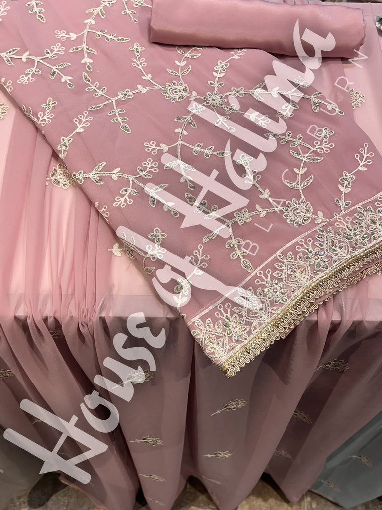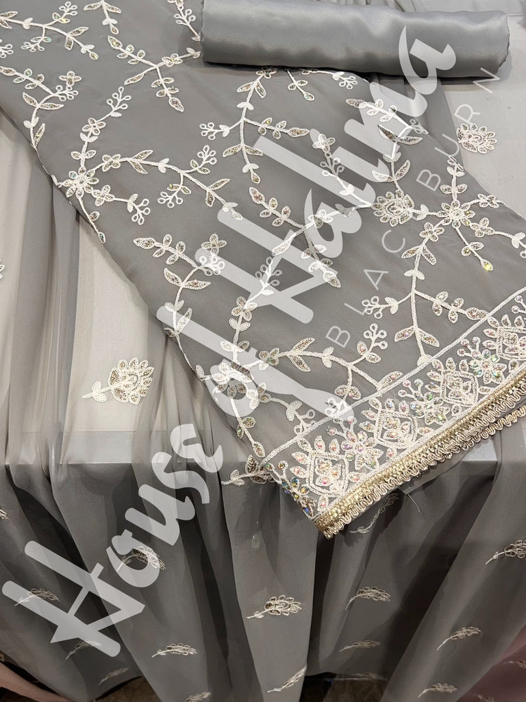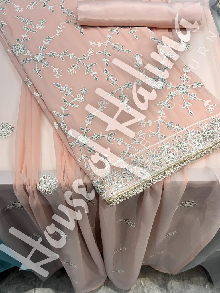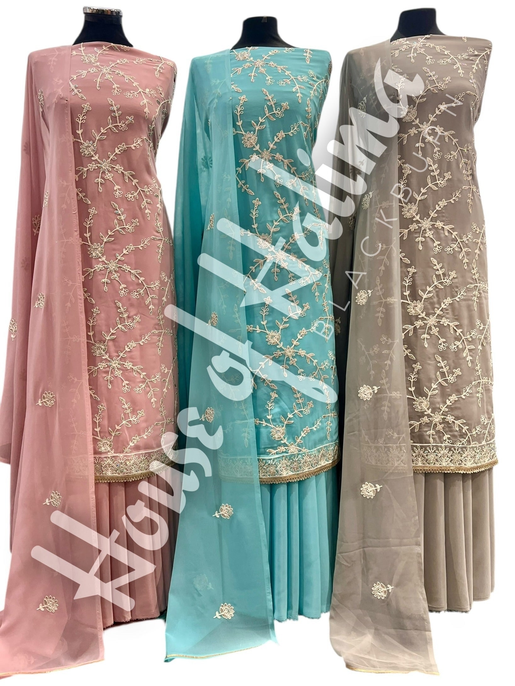 4pc georgette suits with thread embroidery and diamonte embellishements. Comes with embroidered georgette dupatta.