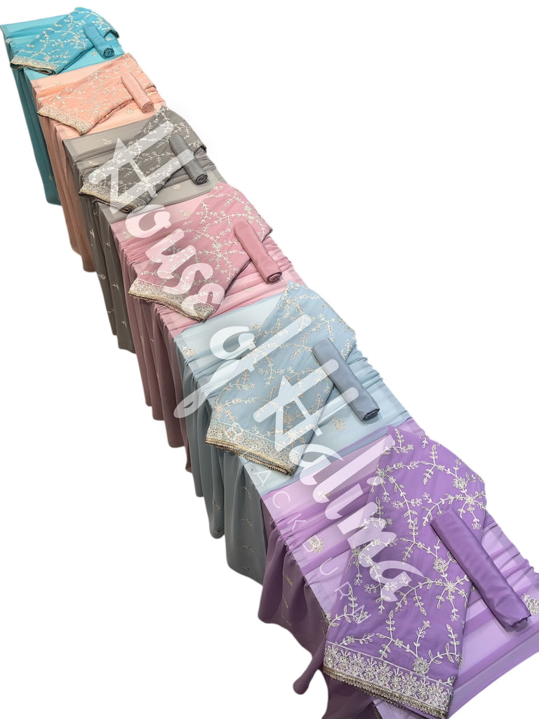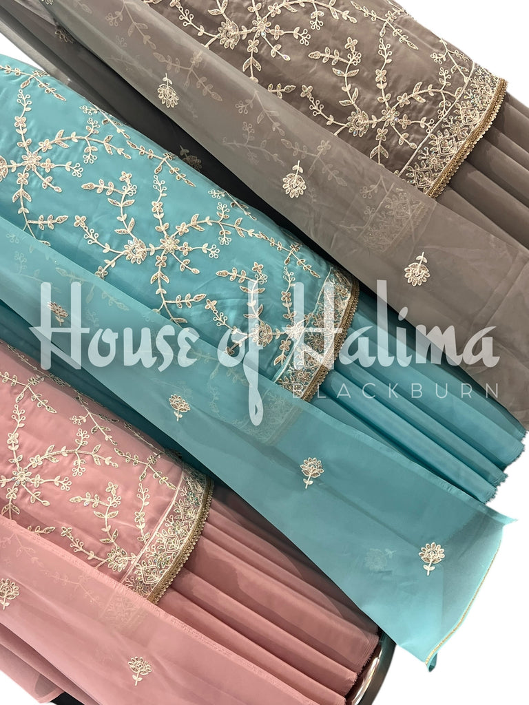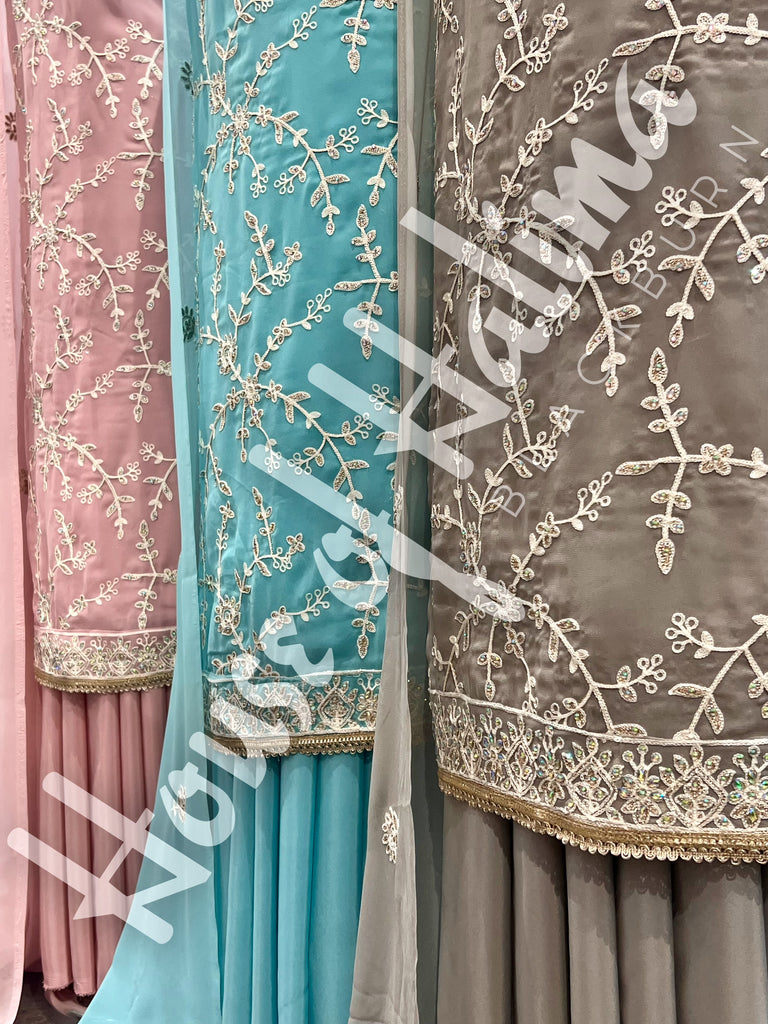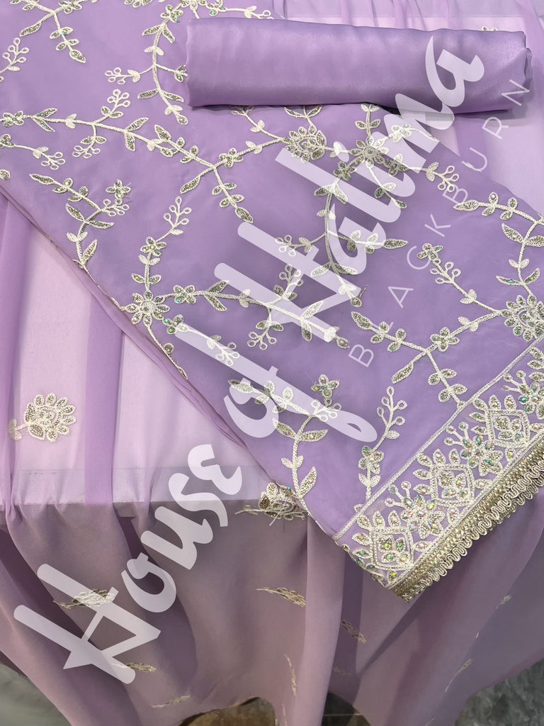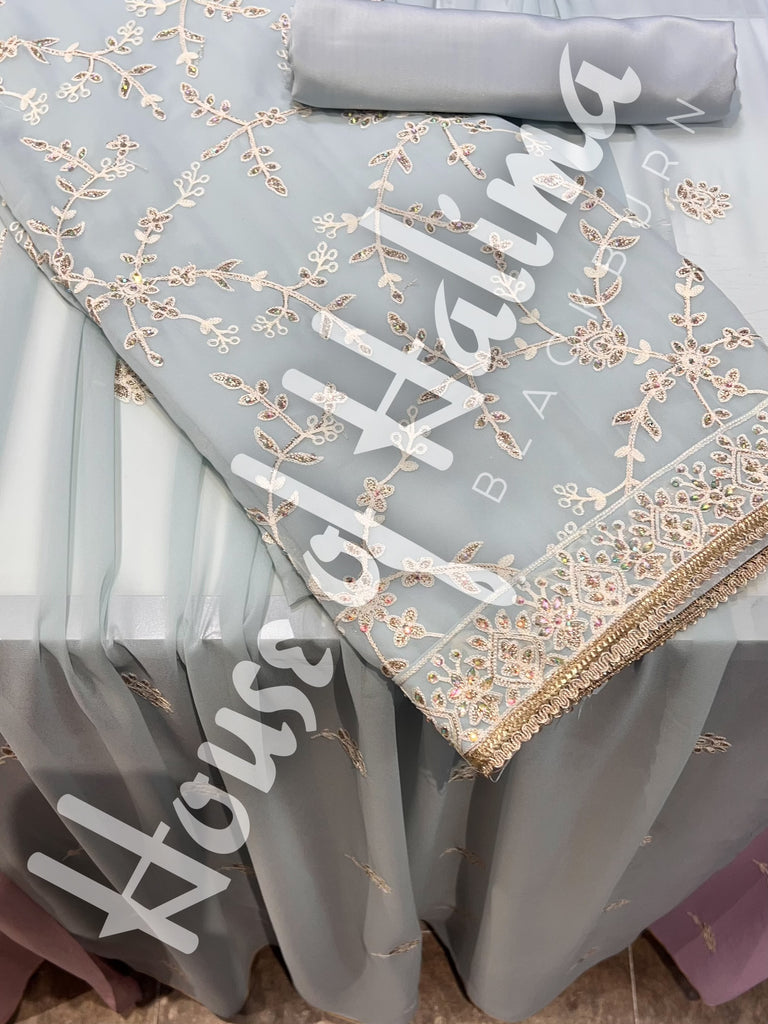 4pc georgette suits with thread embroidery and diamonte embellishements. Comes with embroidered georgette dupatta.