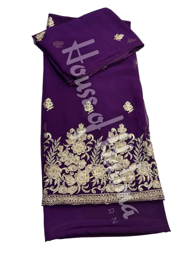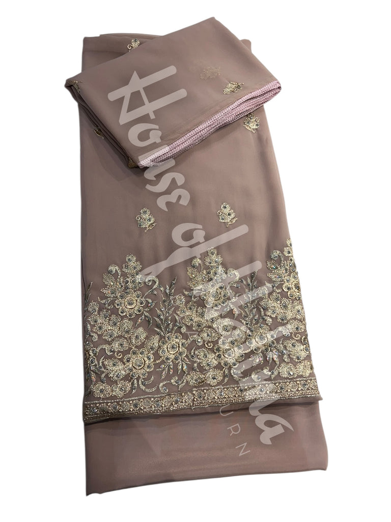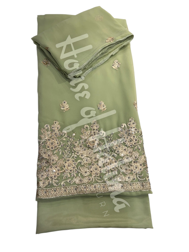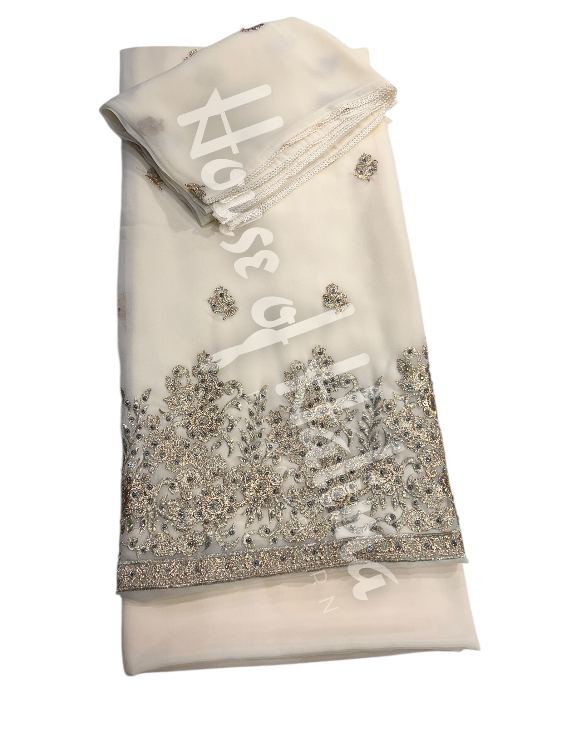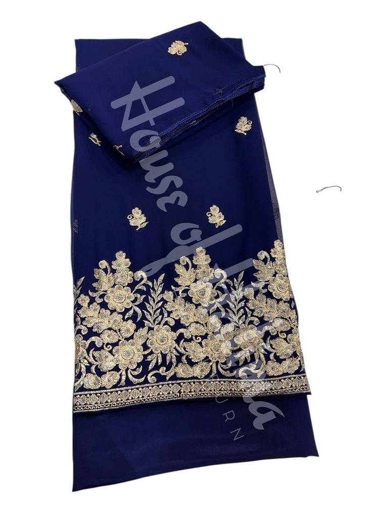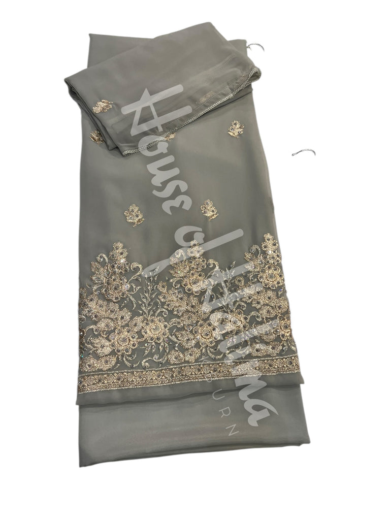 4pc georgette suits with thread embroidery and diamonte embellishements. Comes with embroidered georgette dupatta.