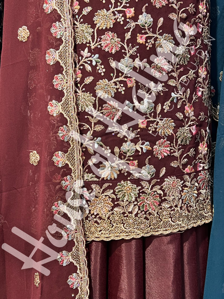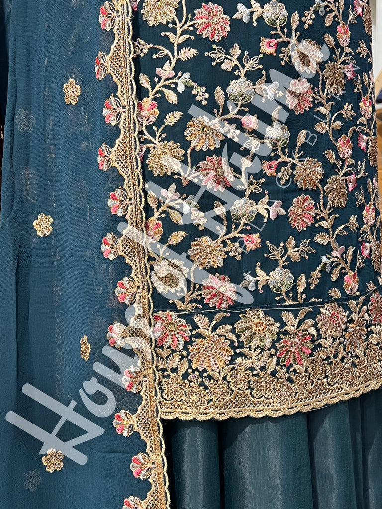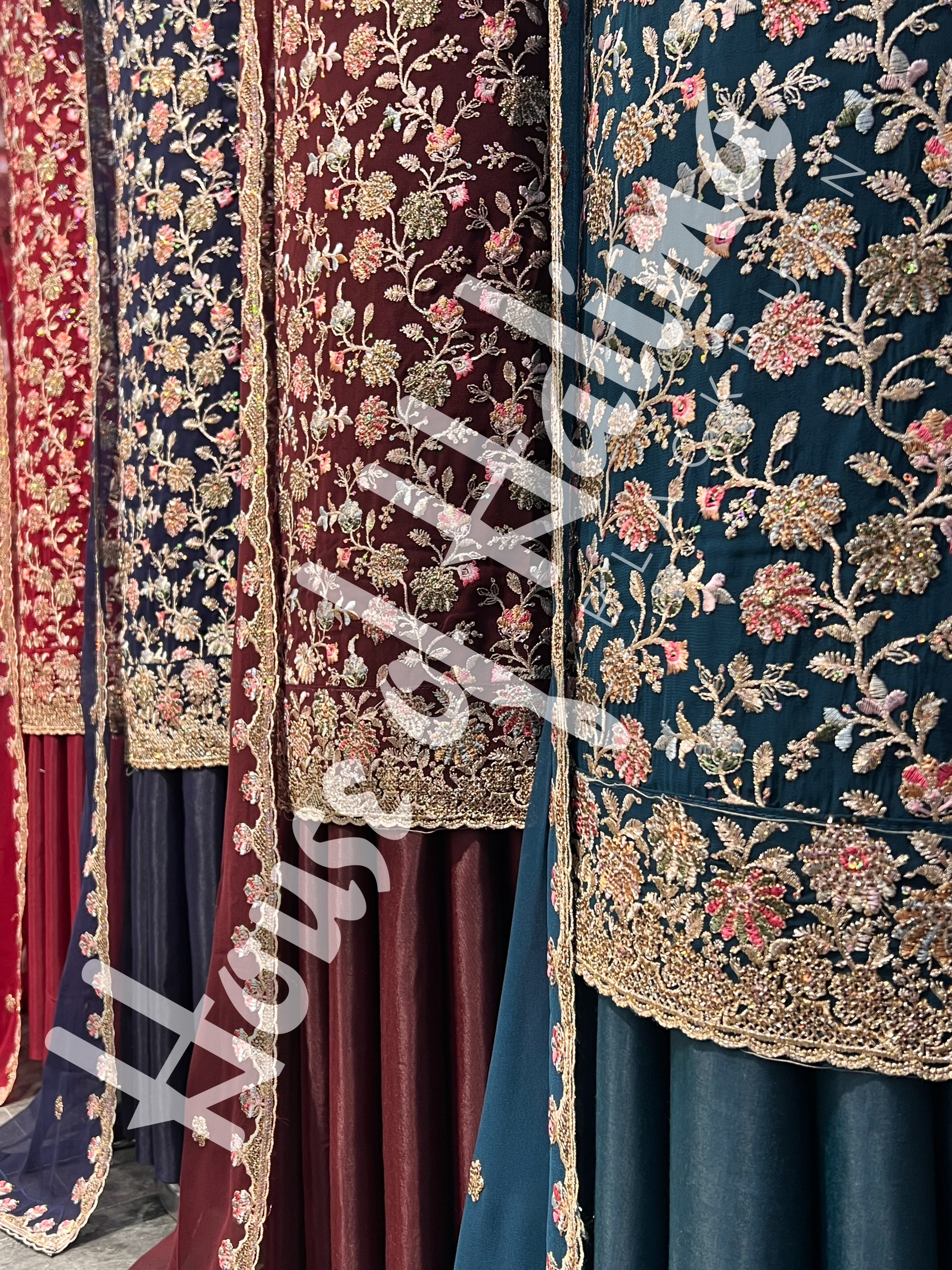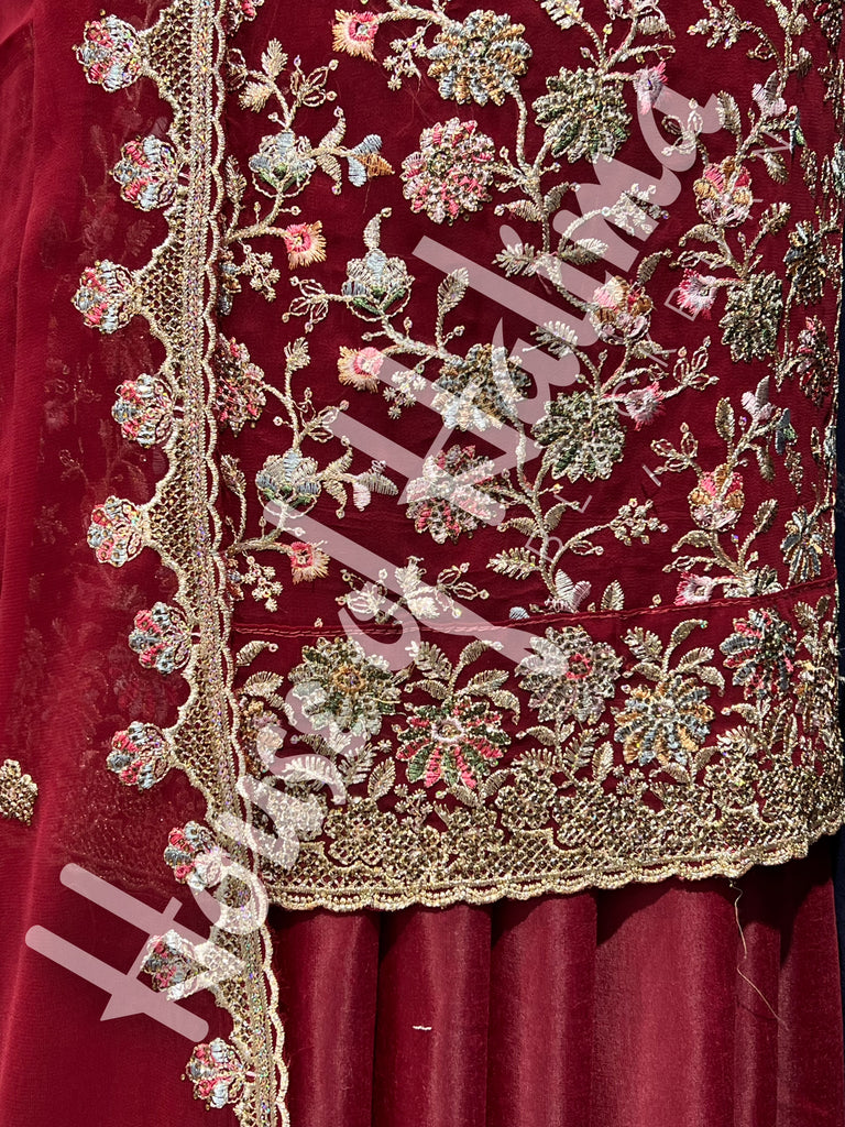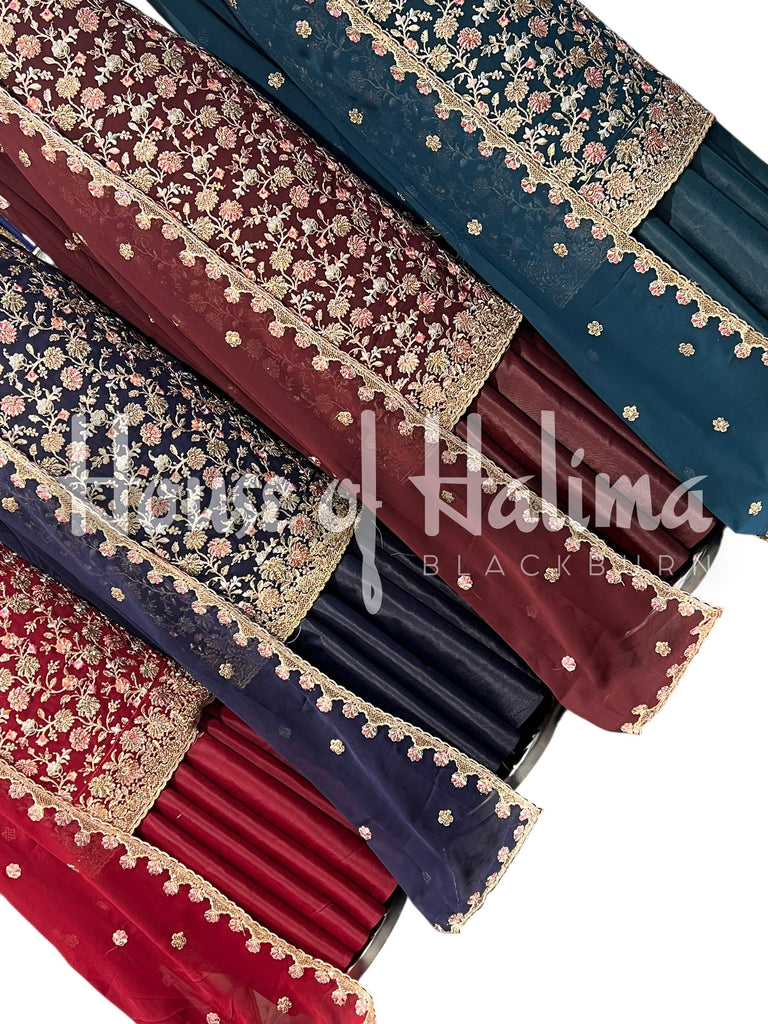 Heavily embroidered georgette suits with diamonte work. Comes with embroidered georgette dupatta.