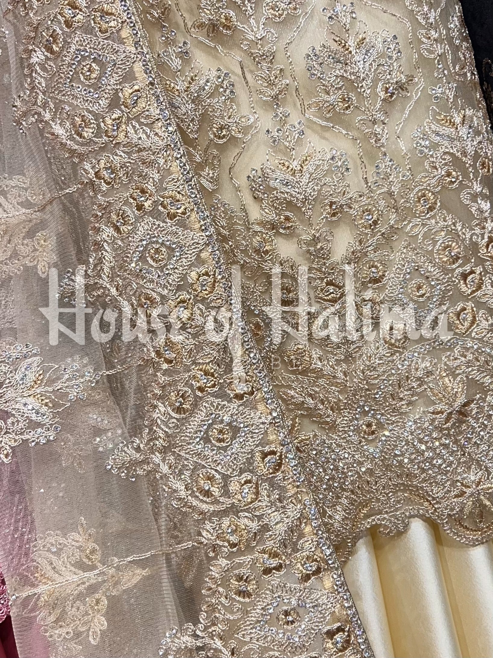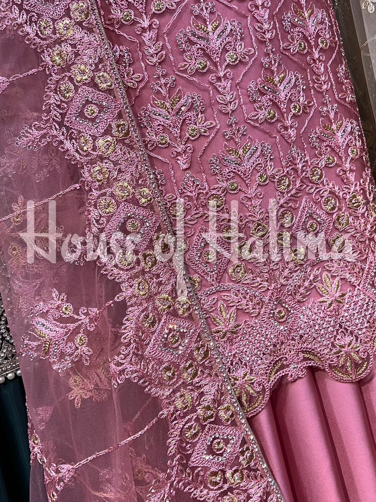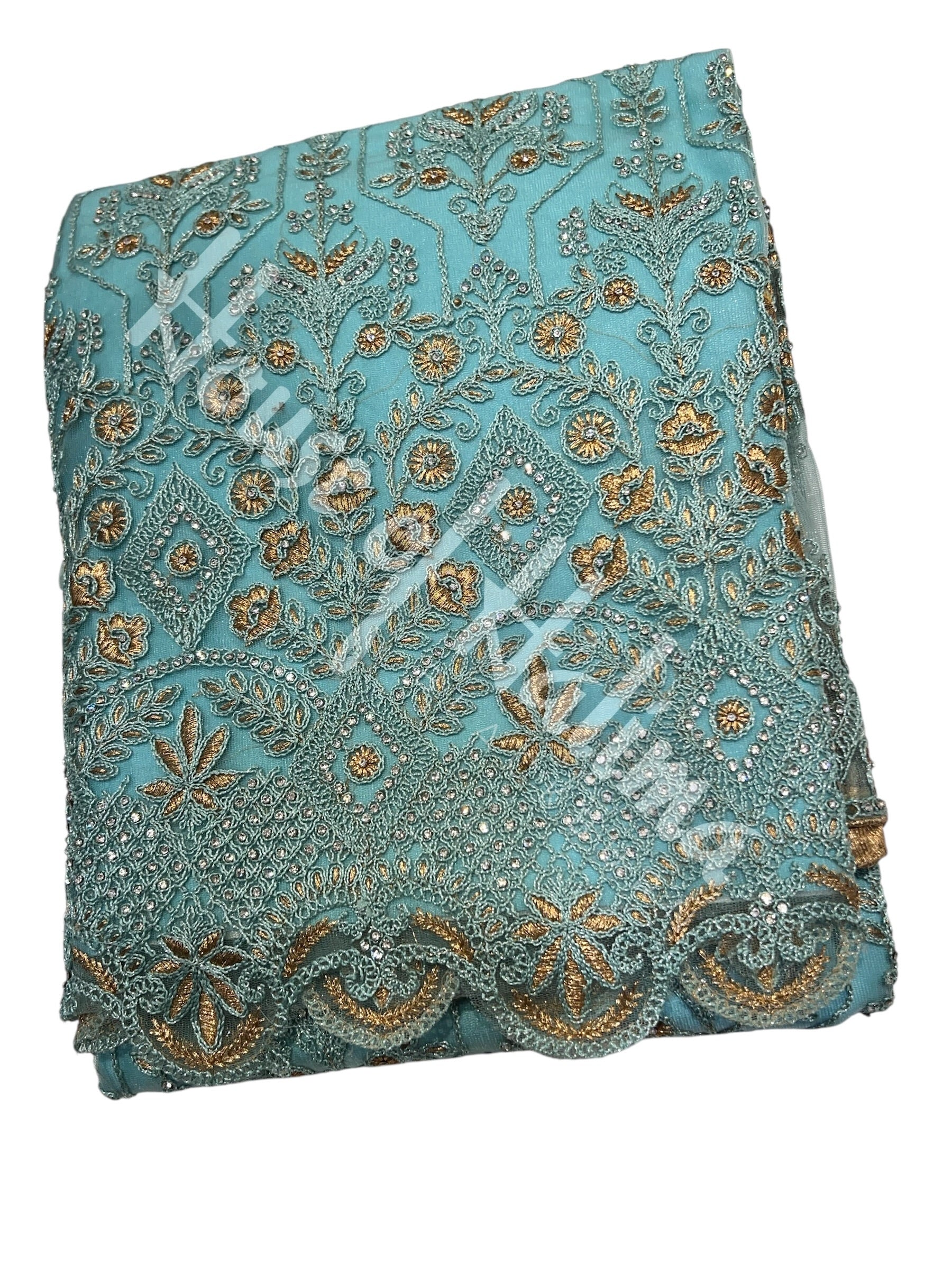Intricately embroidered fancy net suits with threadwork and zarkan stonework. Comes with heavily embroidered net dupatta and silky satin shalwar and lining fabric.