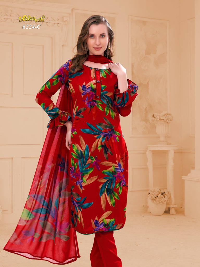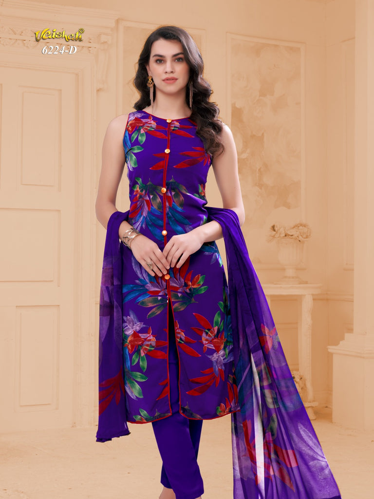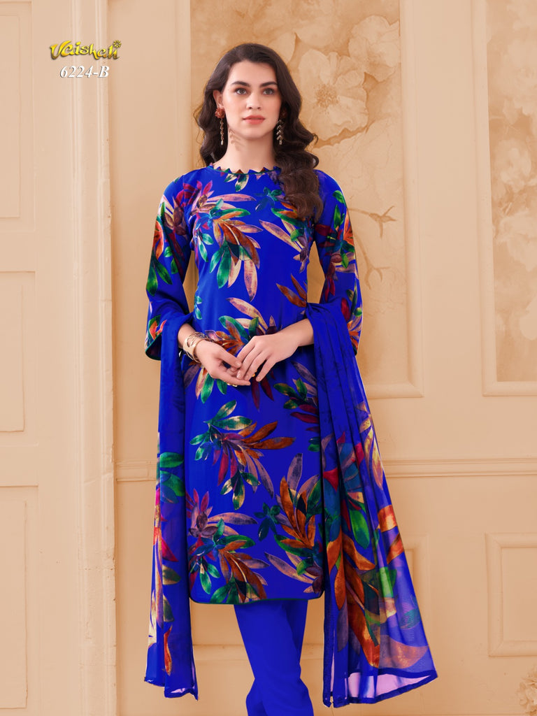 Exquisite quality unstitched french crepe digital prints with printed chiffon dupatta by the one and only Vaishali.