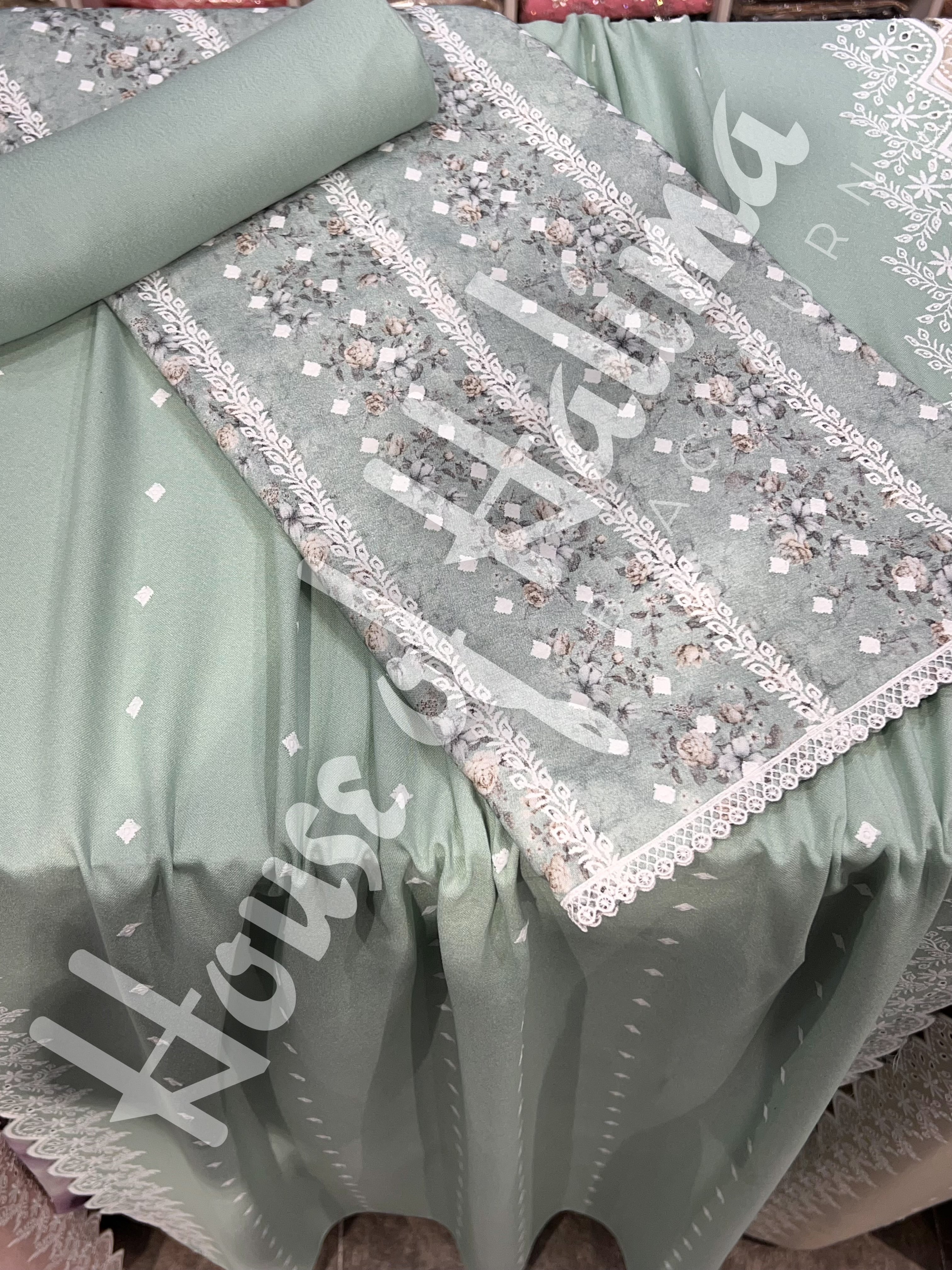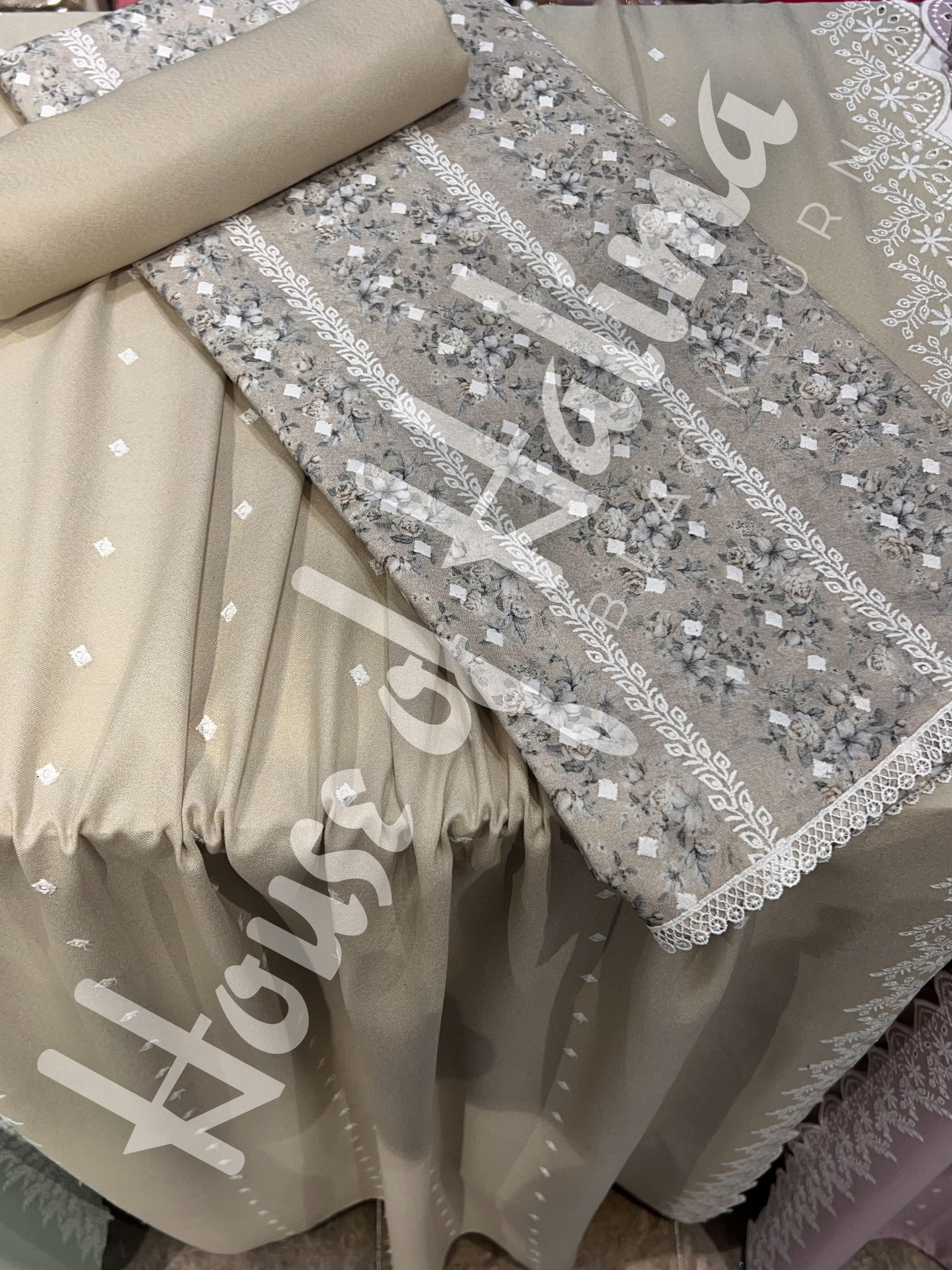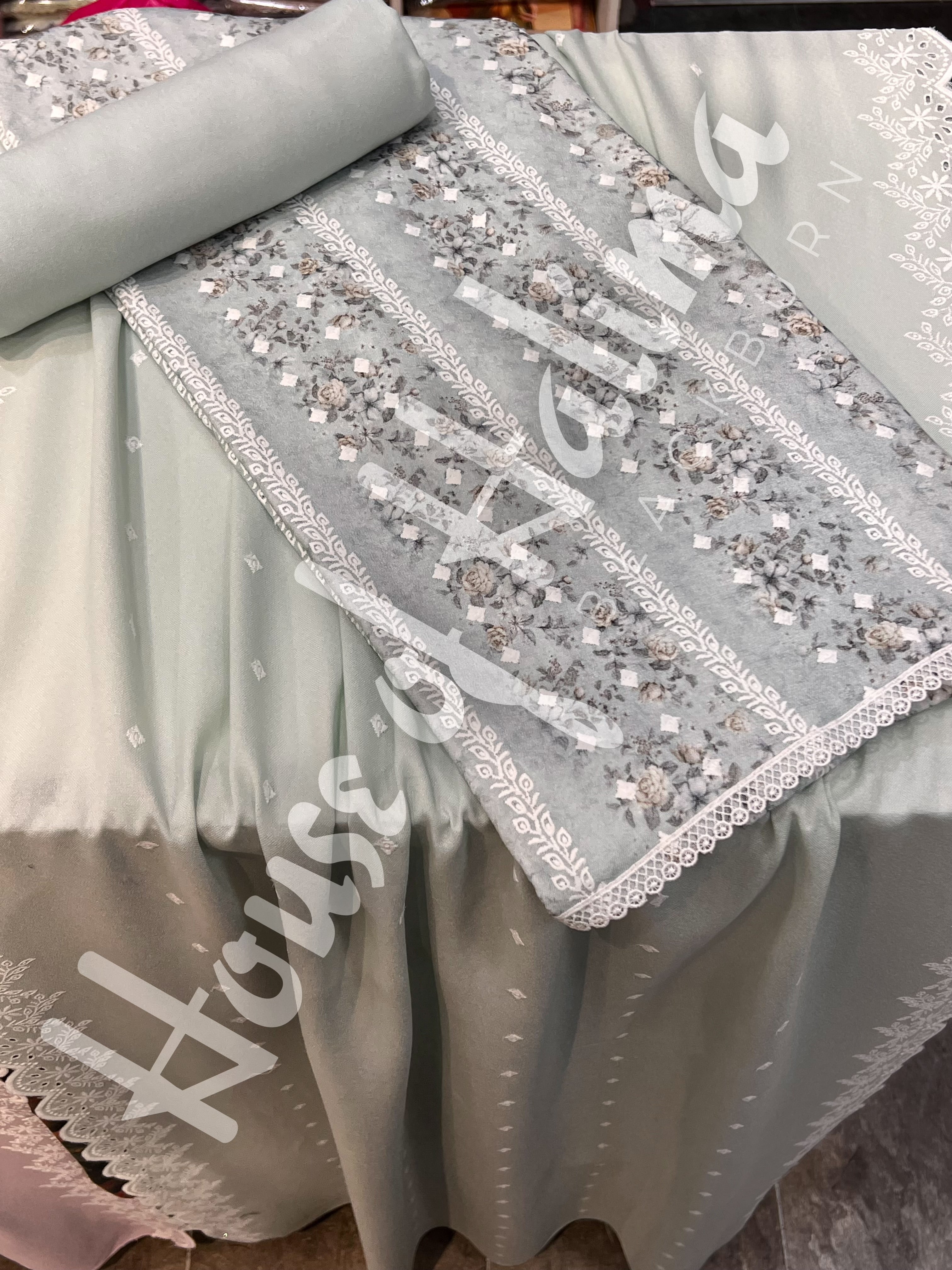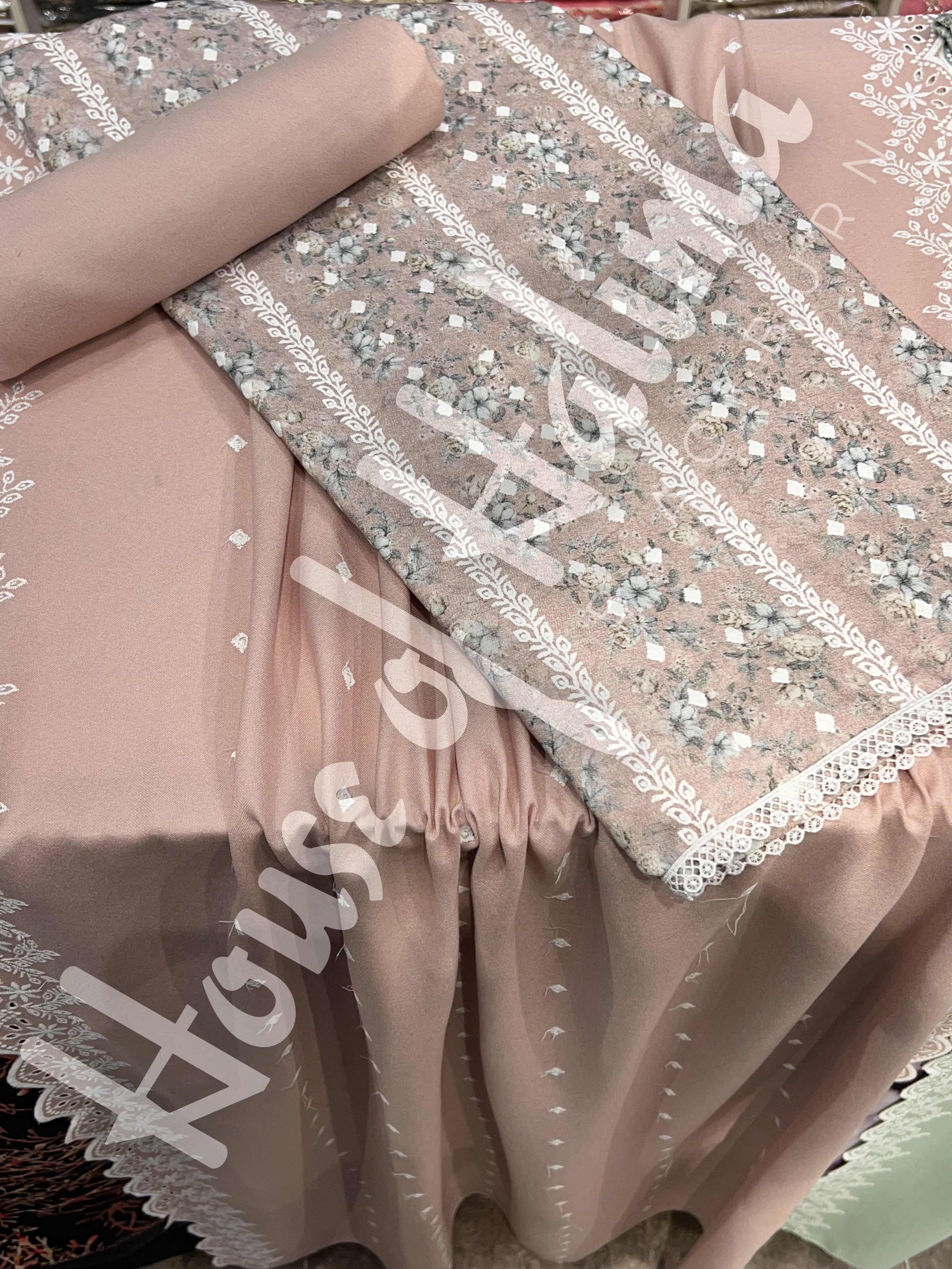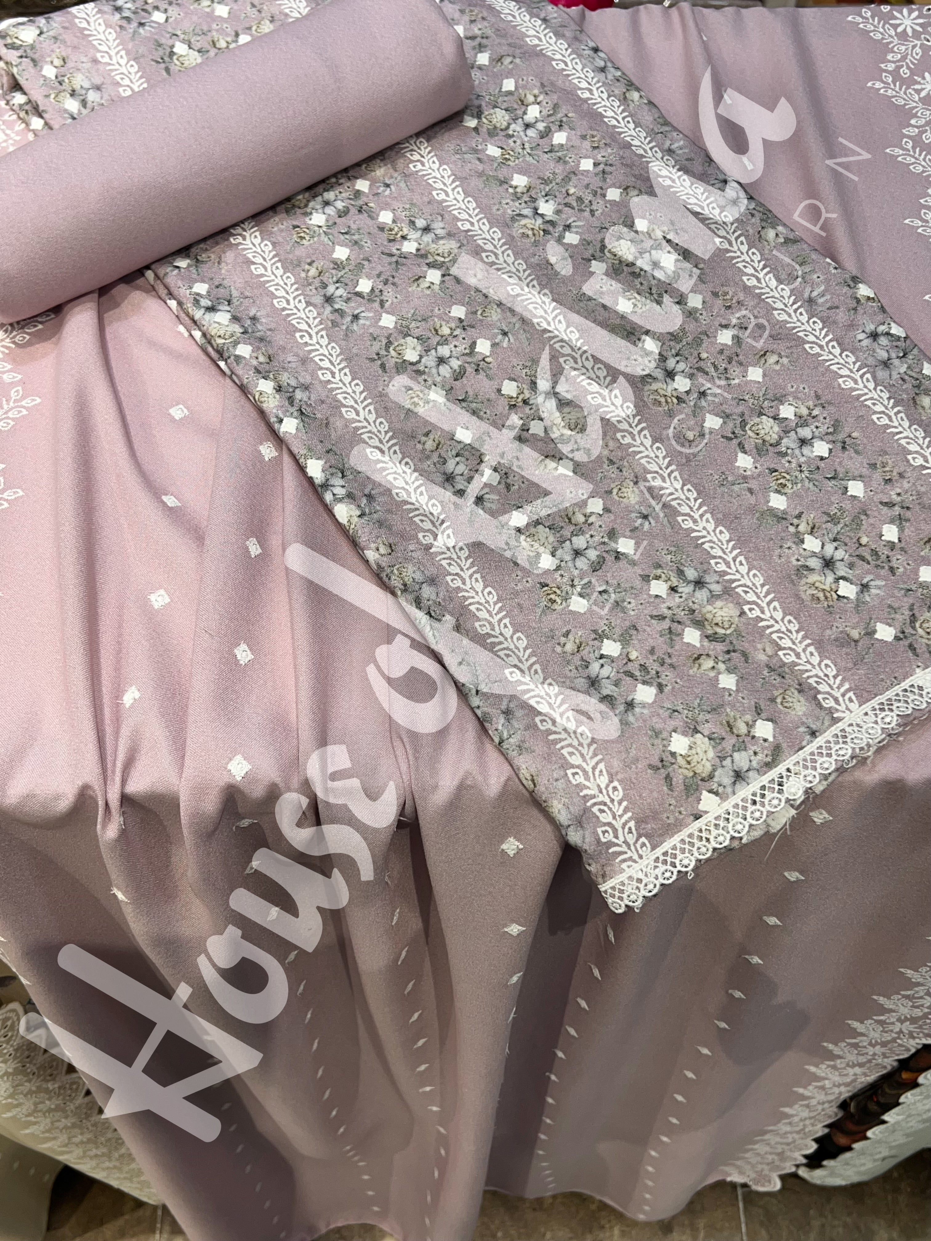 Winter alpine suits with contrast print and allover embroidery. Comes with embroidered alpine shawl.