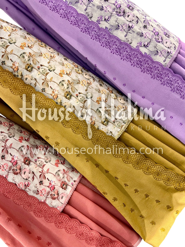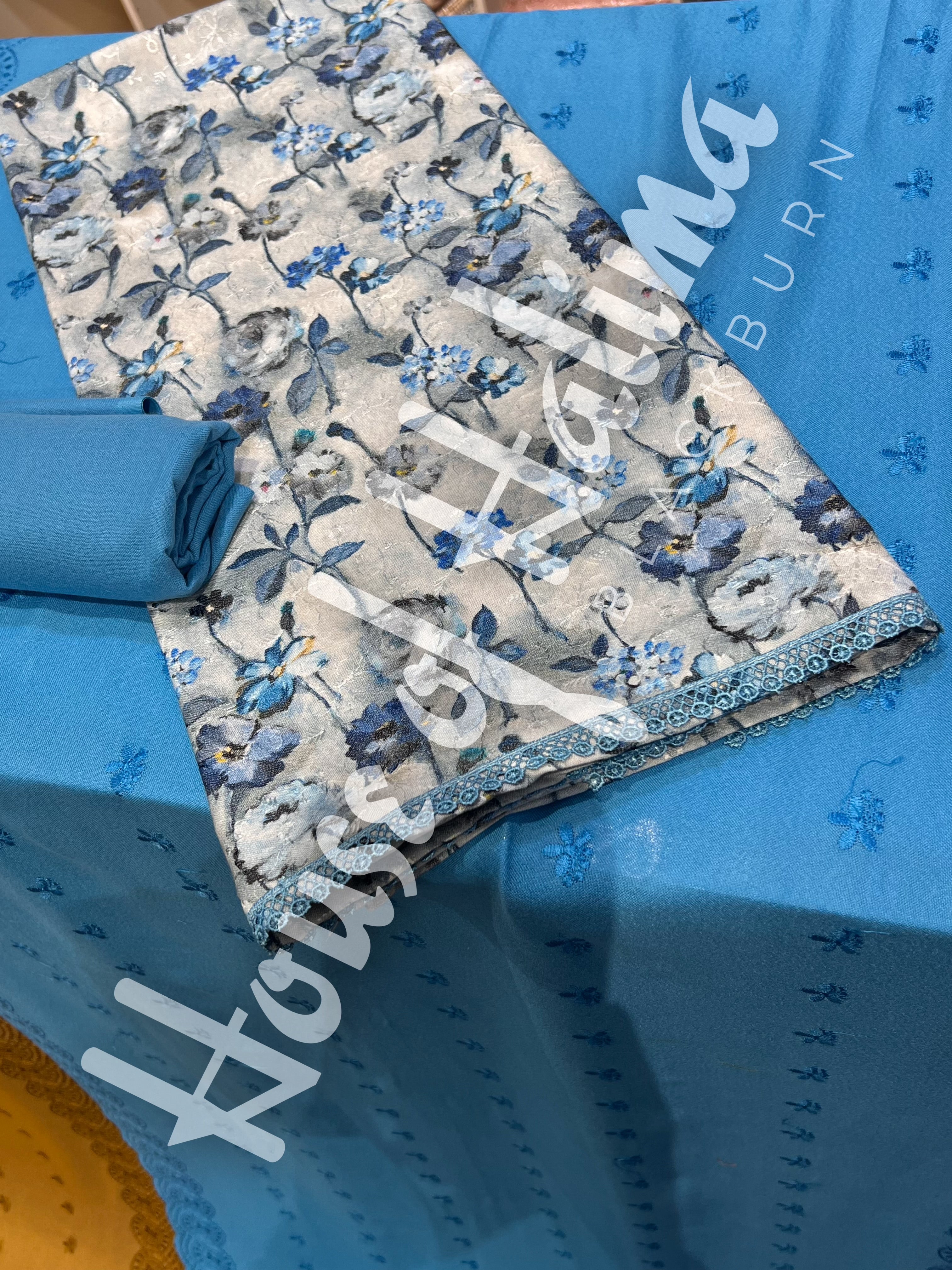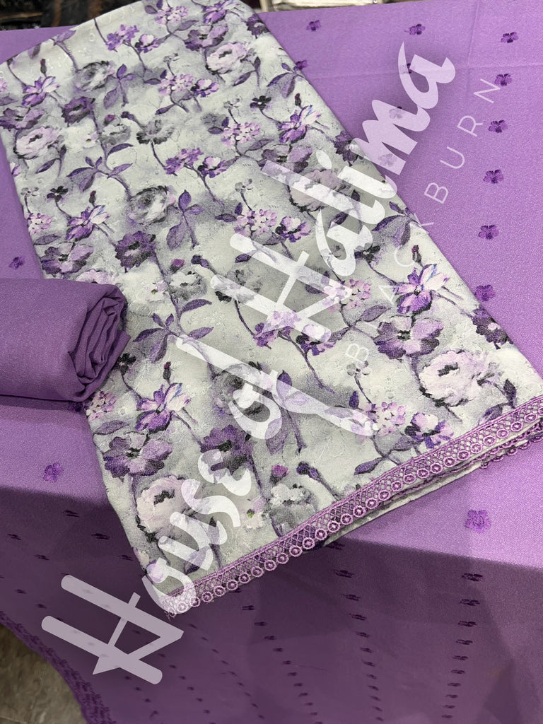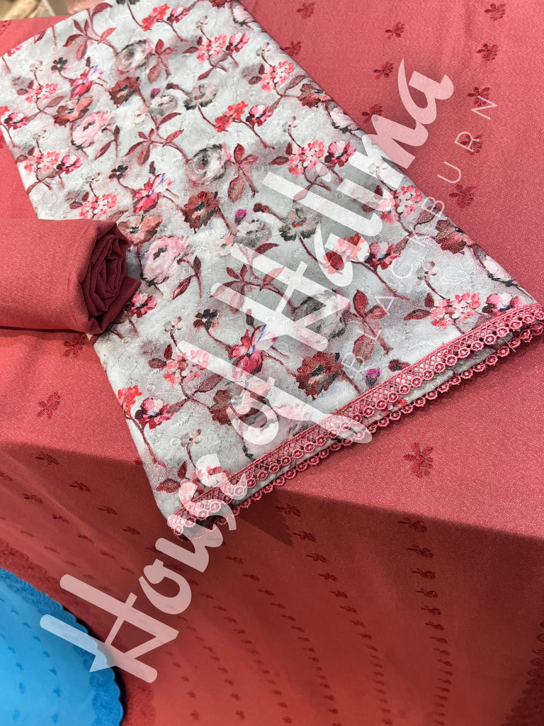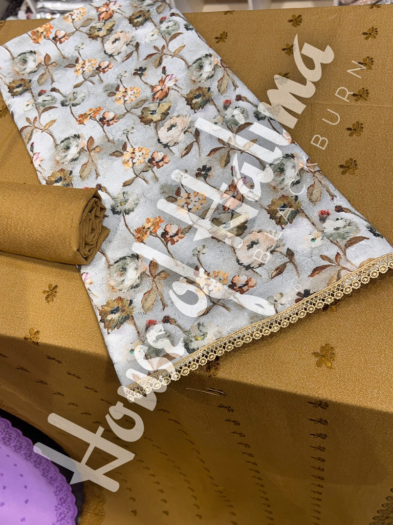 Embroidered alpine suits with full front and back embroidery and contrasted shalwar & shawl. Comes with embroidered alpine shawl.